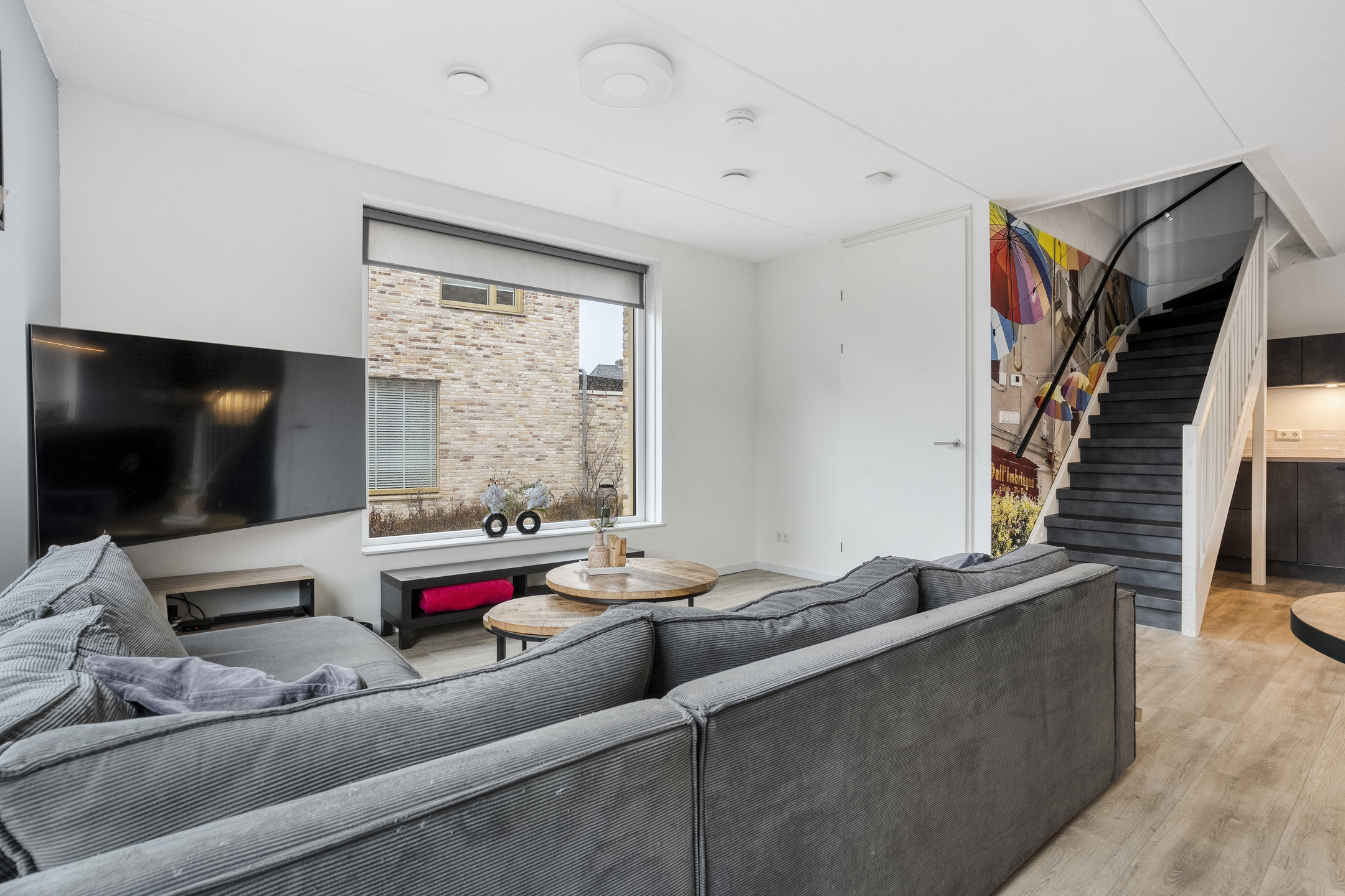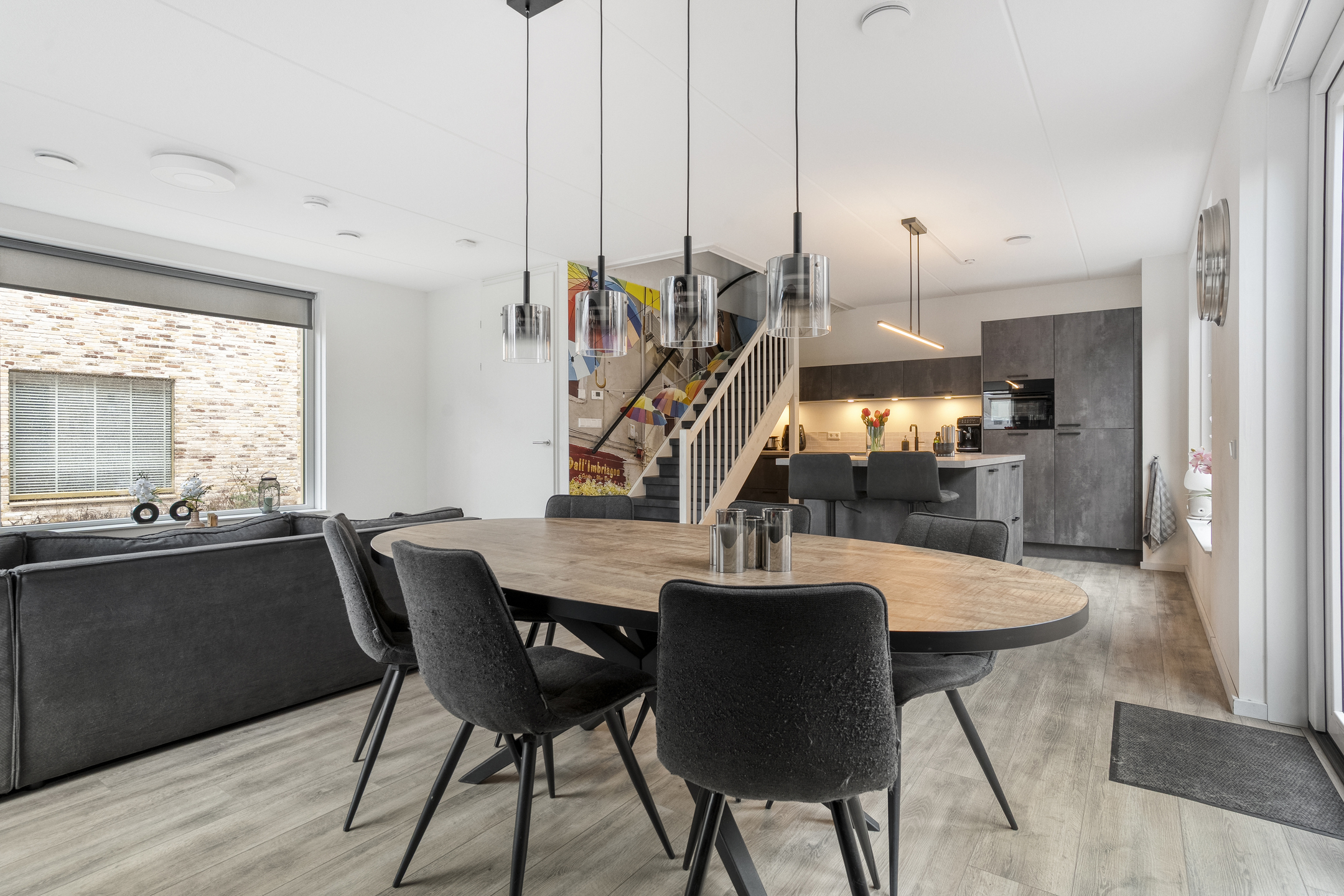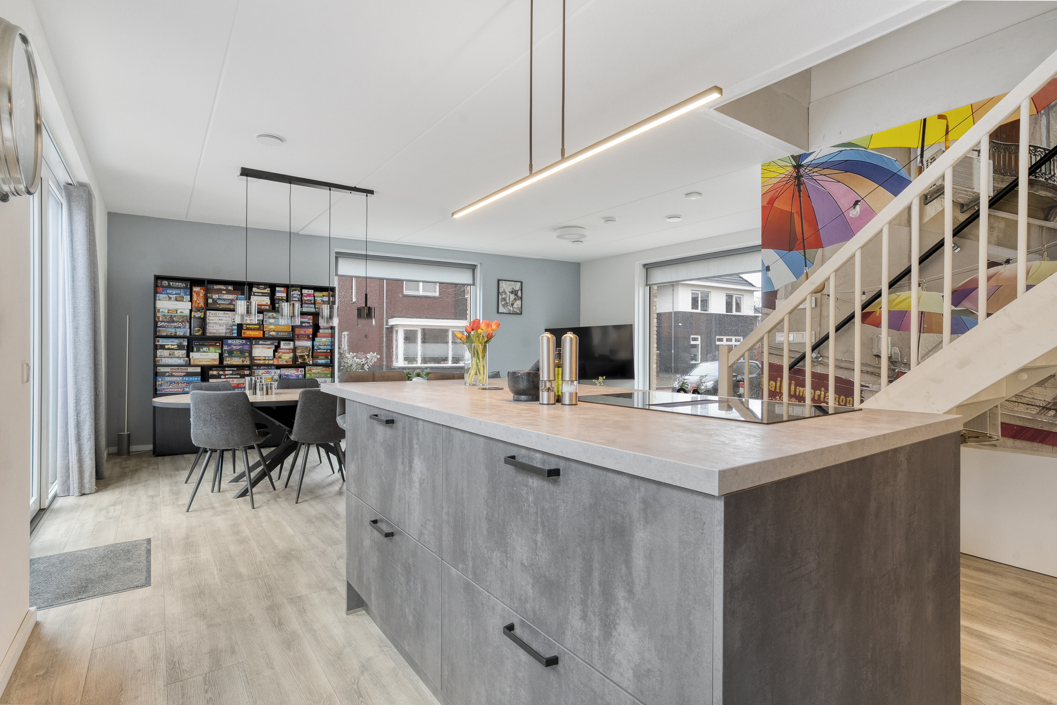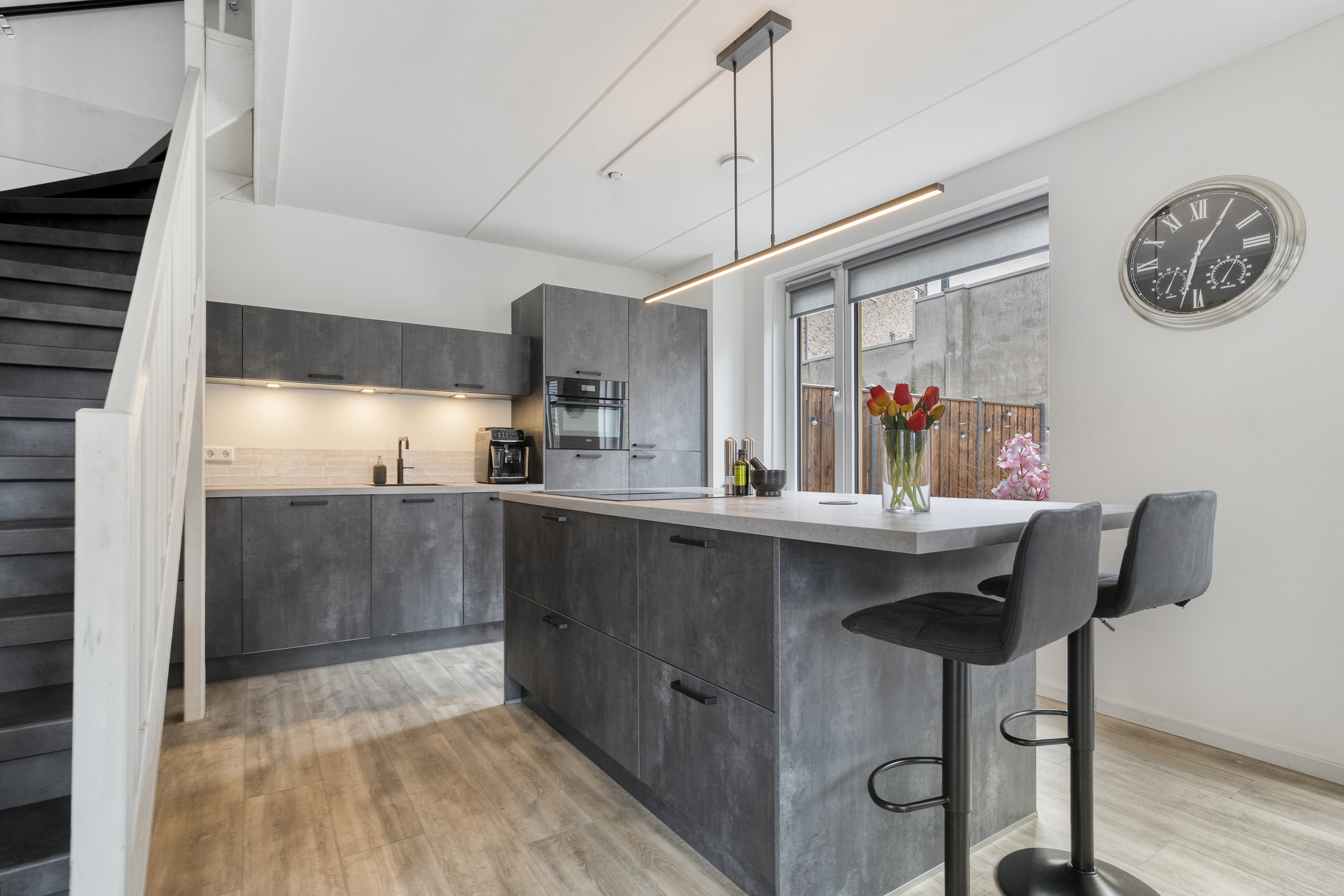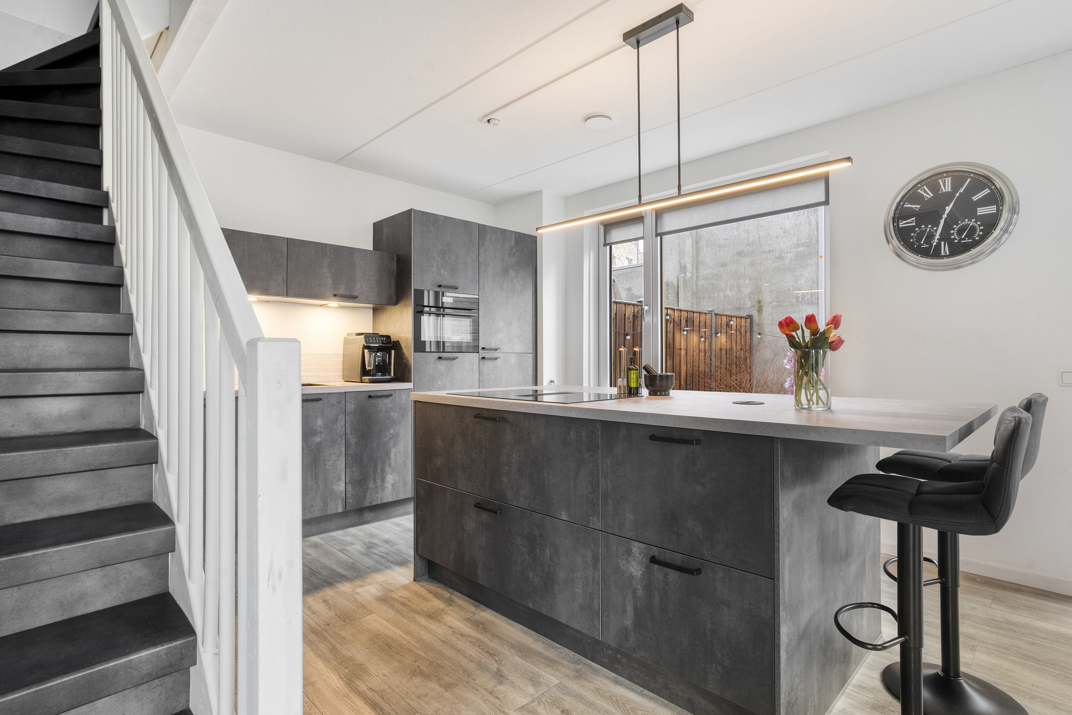 Bij binnenkomst tref je een hal met toegang tot het toilet met fonteintje en de meterkast. De ruime en lichte woonkamer loopt naadloos over in een moderne open keuken, voorzien van diverse inbouwapparatuur en een ruim kookeiland. Dankzij de grote ramen is er volop natuurlijk licht, wat bijdraagt aan een warme en uitnodigende sfeer.