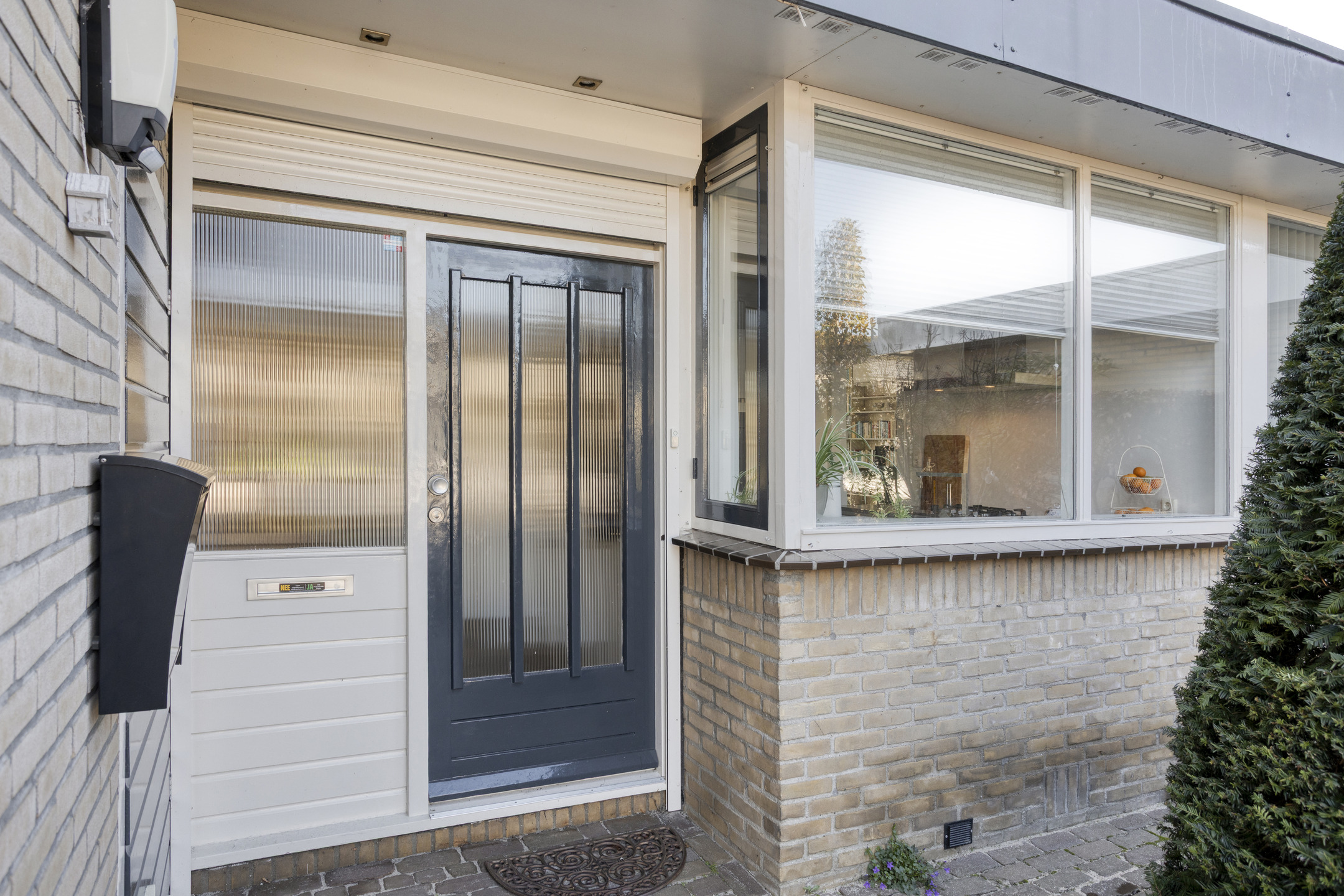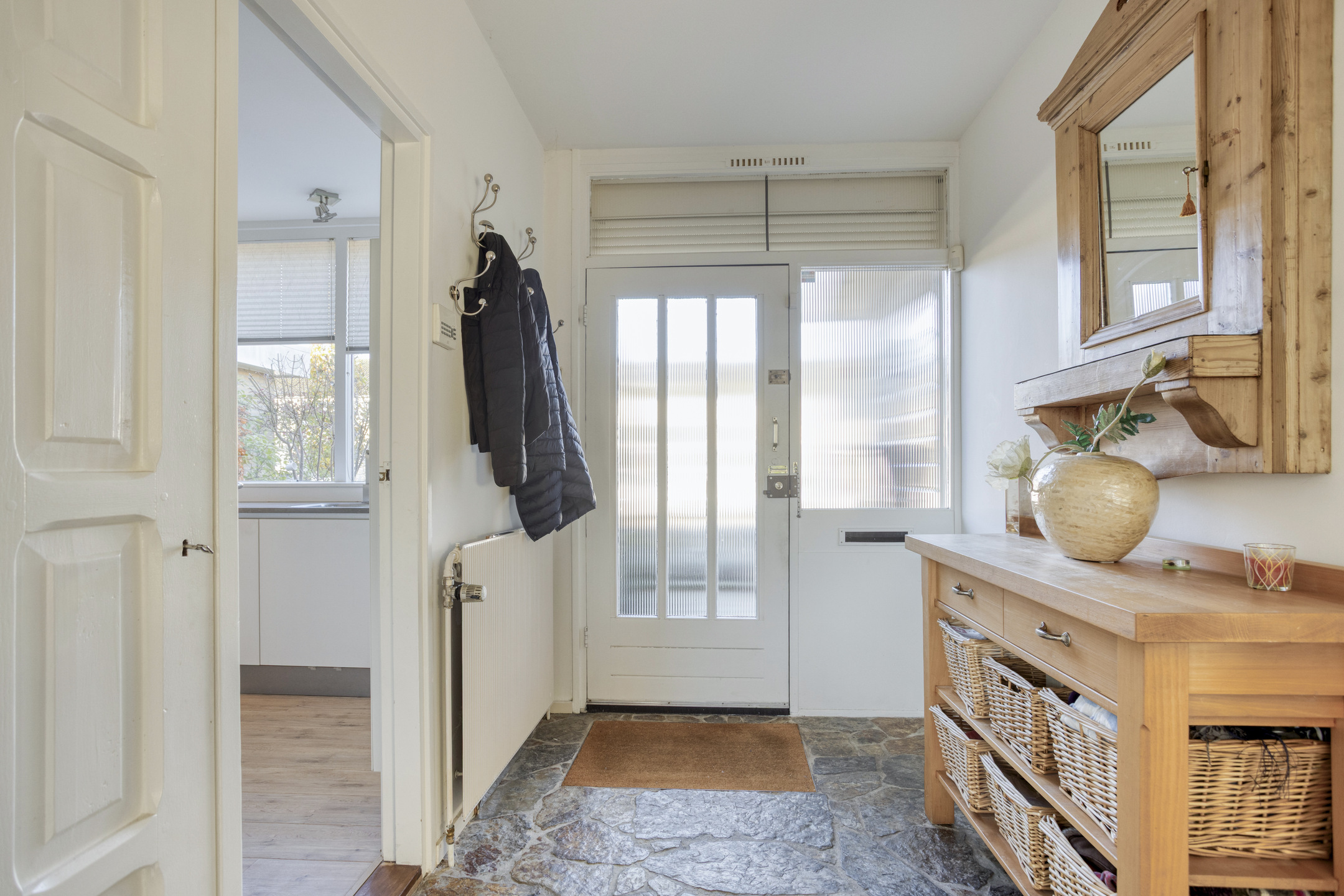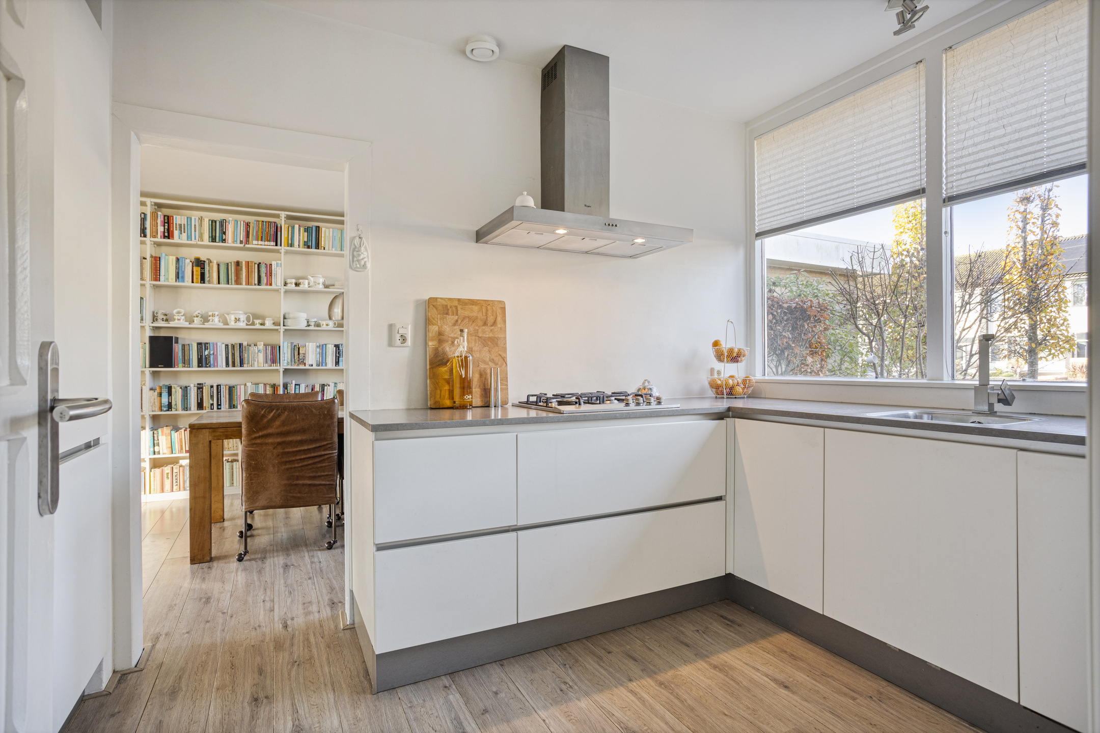 Binnen word je verwelkomd via de overdekte entree in een ruime hal met leisteenvloer. Vanuit hier loopt de woning logisch en comfortabel door. De dichte keuken is modern, compleet uitgerust met inbouwapparatuur en voorzien van een stijlvolle designradiator. Aansluitend ligt de L-vormige woonkamer, licht en ruimtelijk, met een schuifpui naar de tuin waardoor binnen en buiten moeiteloos in elkaar overlopen.