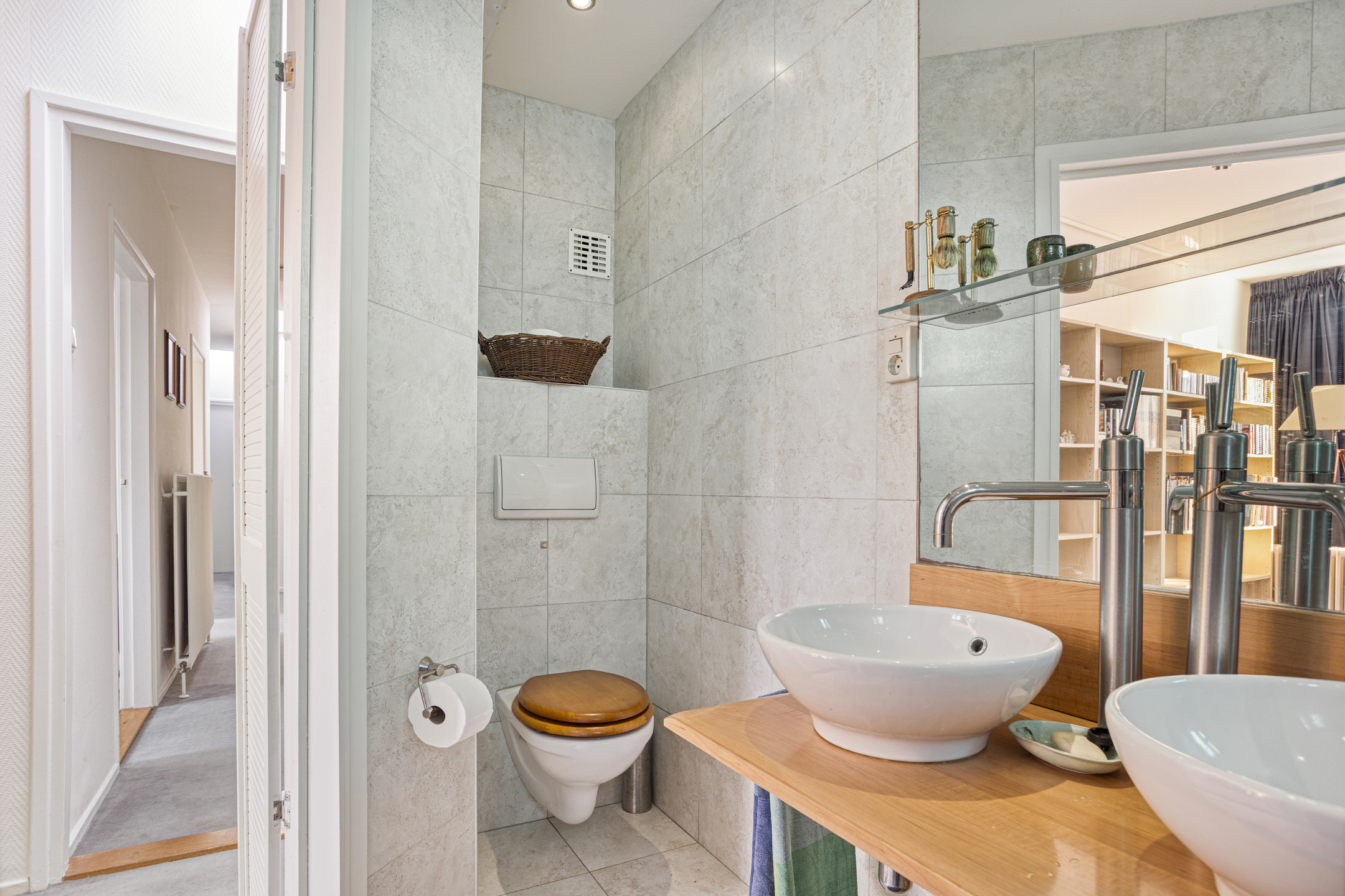 In het hart van de bungalow bevindt zich een praktische tussenhal met vaste kastenwand en wasruimte met cv-opstelling. Vanuit hier zijn ook de slaapkamers bereikbaar. Twee daarvan hebben een eigen deur naar de tuin, ideaal voor wie graag ’s ochtends direct buiten stapt. De royale hoofdslaapkamer is extra licht dankzij een grote lichtkoepel, beschikt over een eigen badkamer met ligbad/douche, dubbele wastafel in meubel en een hangend toilet en heeft eveneens directe toegang tot de tuin. De tweede badkamer, eveneens modern en netjes uitgevoerd, is voorzien van een inloopdouche, hangend toilet en wastafelmeubel.