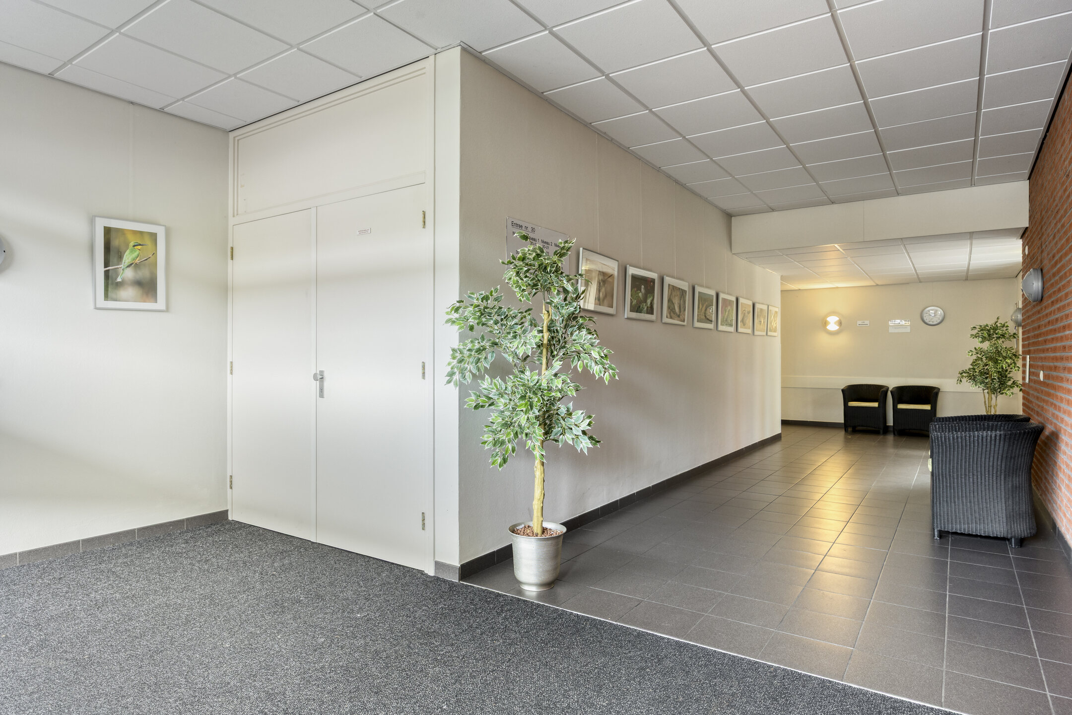Complex: overdekte entree, centrale hal met brievenbussen, liftinstallatie en trappenhuis.