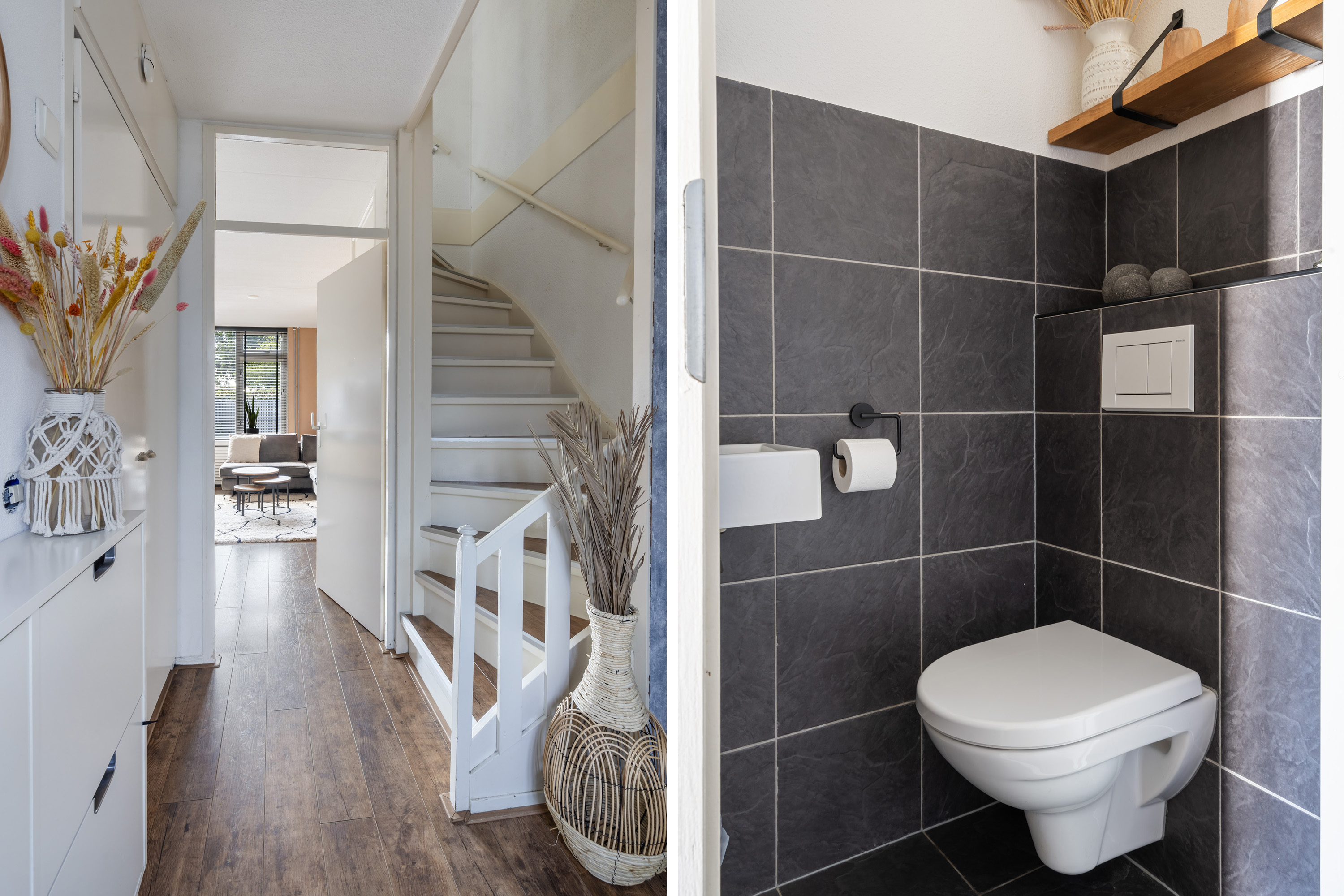 Begane grond: entree, hal met toilet en fonteintje, meterkast en trapopgang, straatgerichte open keuken voorzien van een moderne inbouwkeuken met diverse apparatuur, tuingerichte woonkamer met trapkast en loopdeur naar de achtertuin.