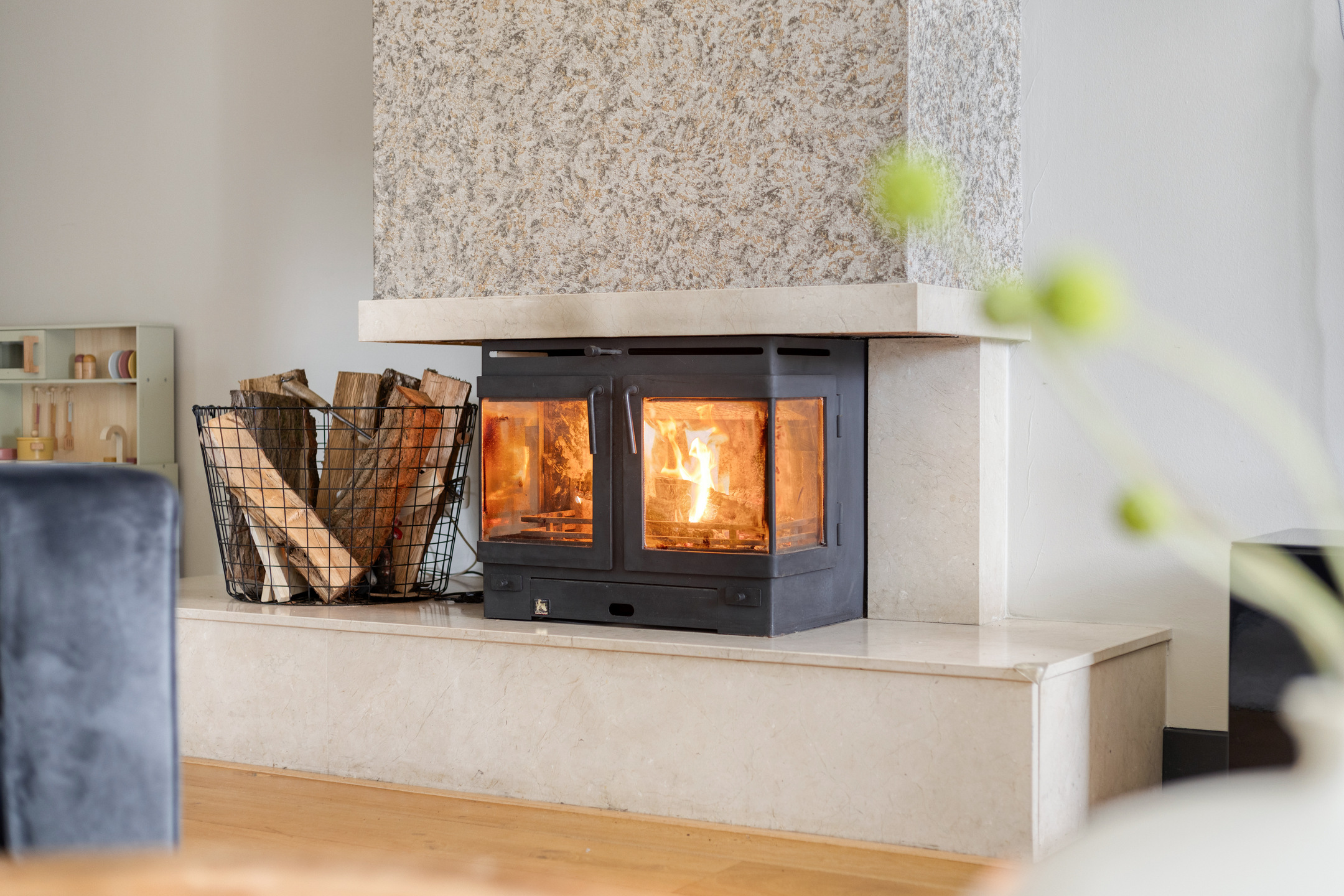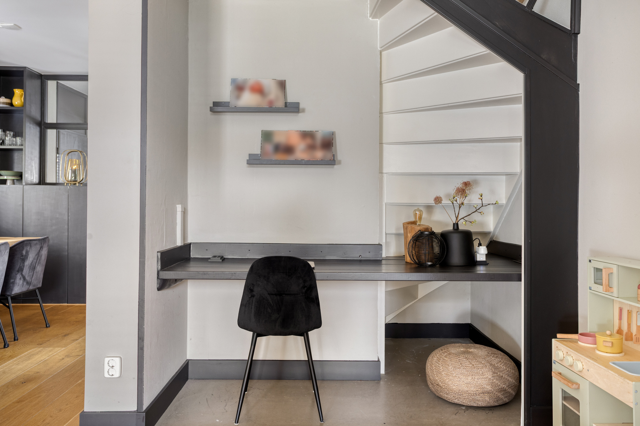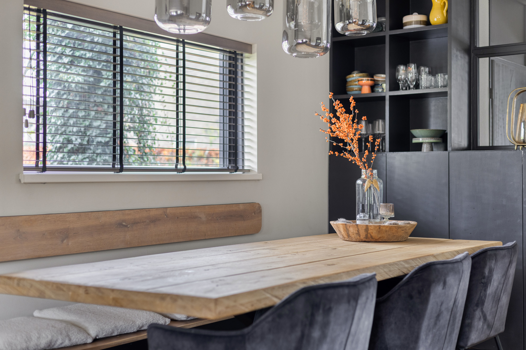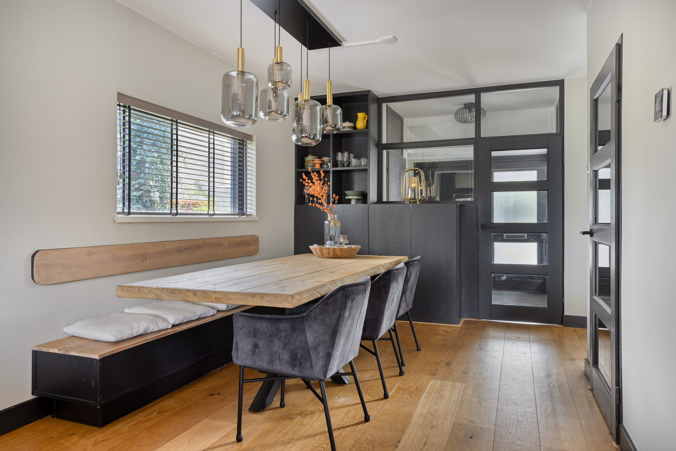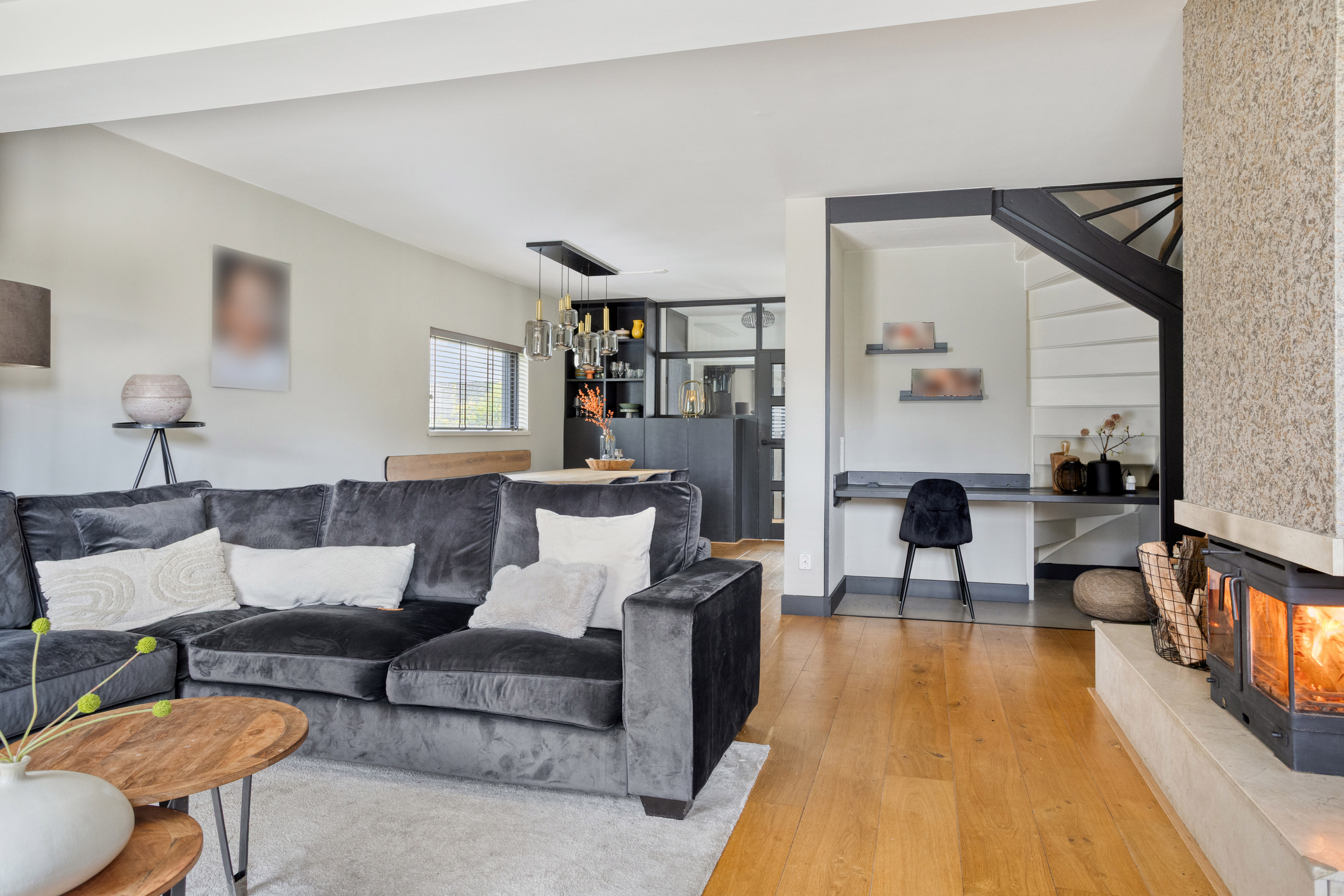 Je komt binnen via de overdekte entree, waar de hal toegang geeft tot de meterkast én de praktisch inpandige berging met witgoedaansluitingen. Ook vind je hier het moderne, hangende toilet met fonteintje. Vanuit de hal stap je de straatgerichte open keuken in: een eigentijdse inbouwkeuken met alle benodigde apparatuur en veel werkruimte. De keuken loopt vloeiend over in de gezellige eetkamer met vaste kast, perfect voor lange avonden met familie of vrienden. Via de tussenhal vervolg je je weg naar de tuingerichte woonkamer, die dankzij de uitbouw heerlijk royaal is. De houtkachel zorgt voor sfeer, er is ruimte voor een fijne werkplek en de brede schuifpui laat de achtertuin bijna onderdeel worden van de living.