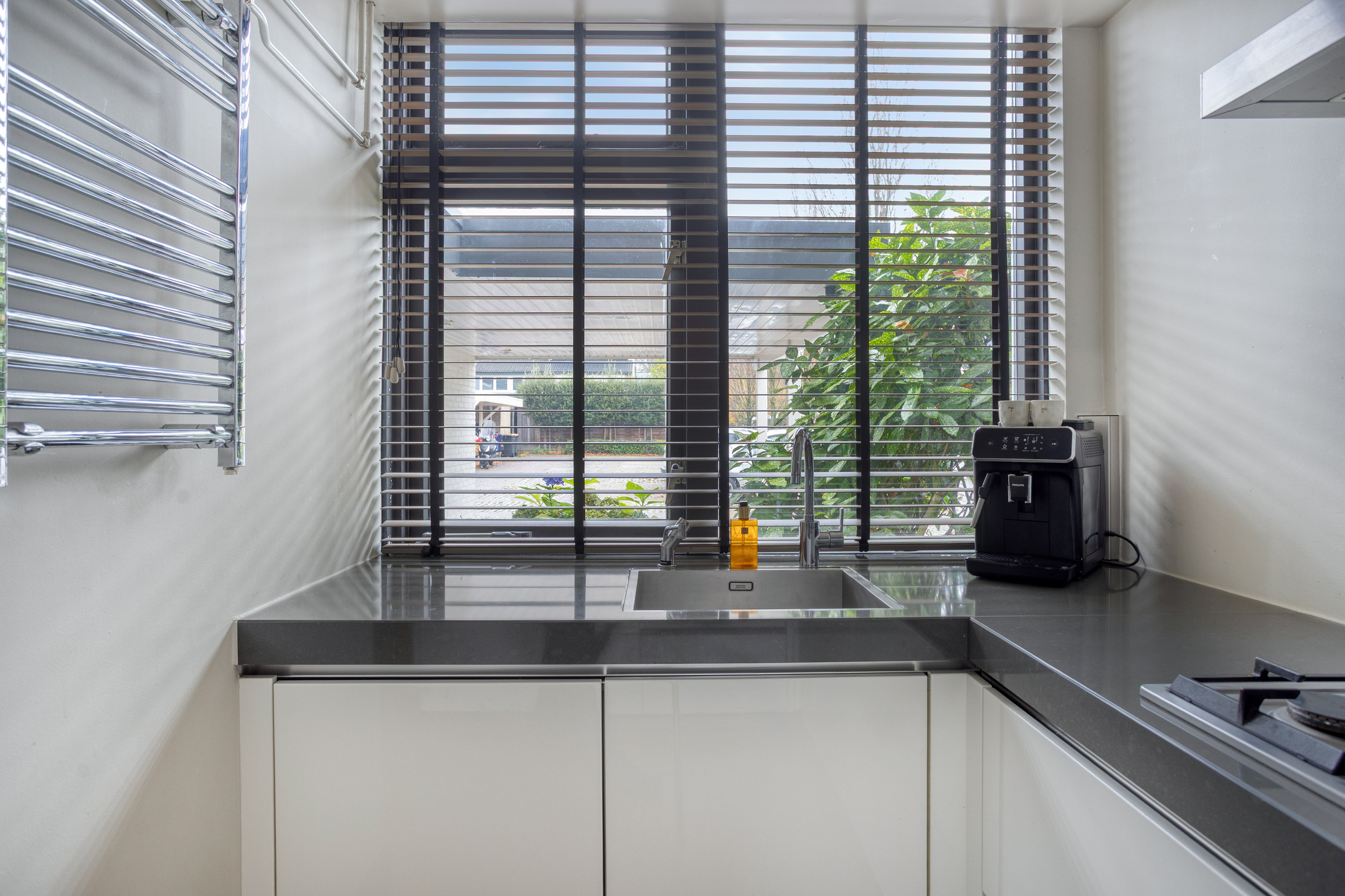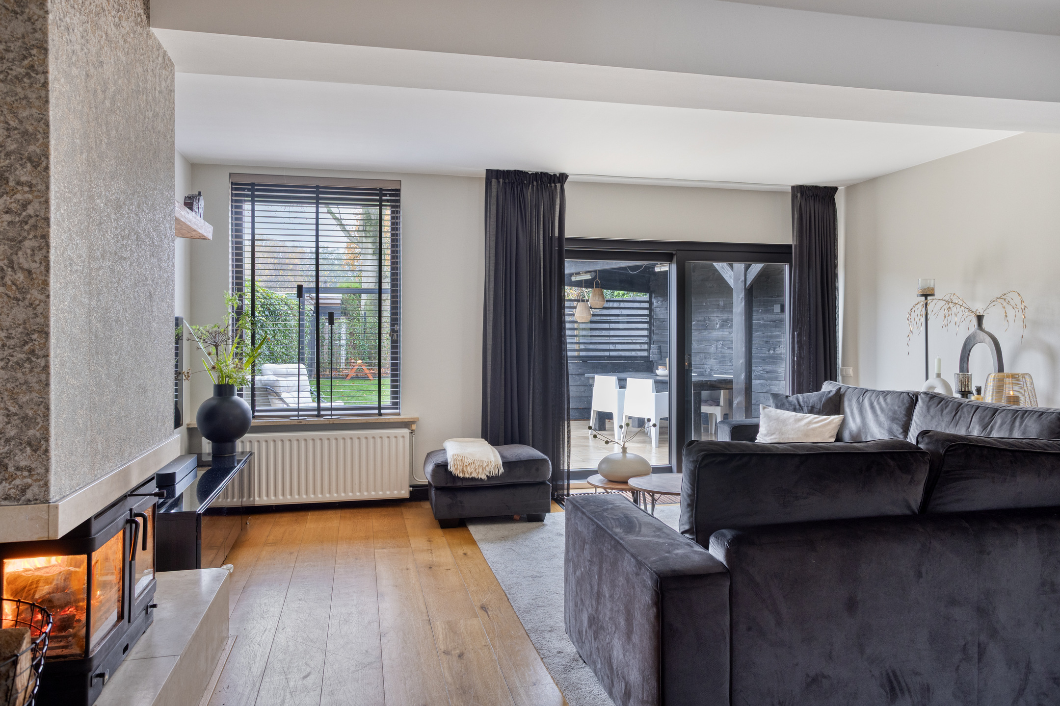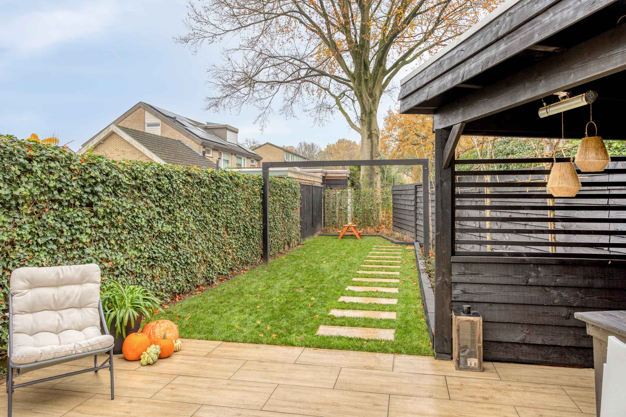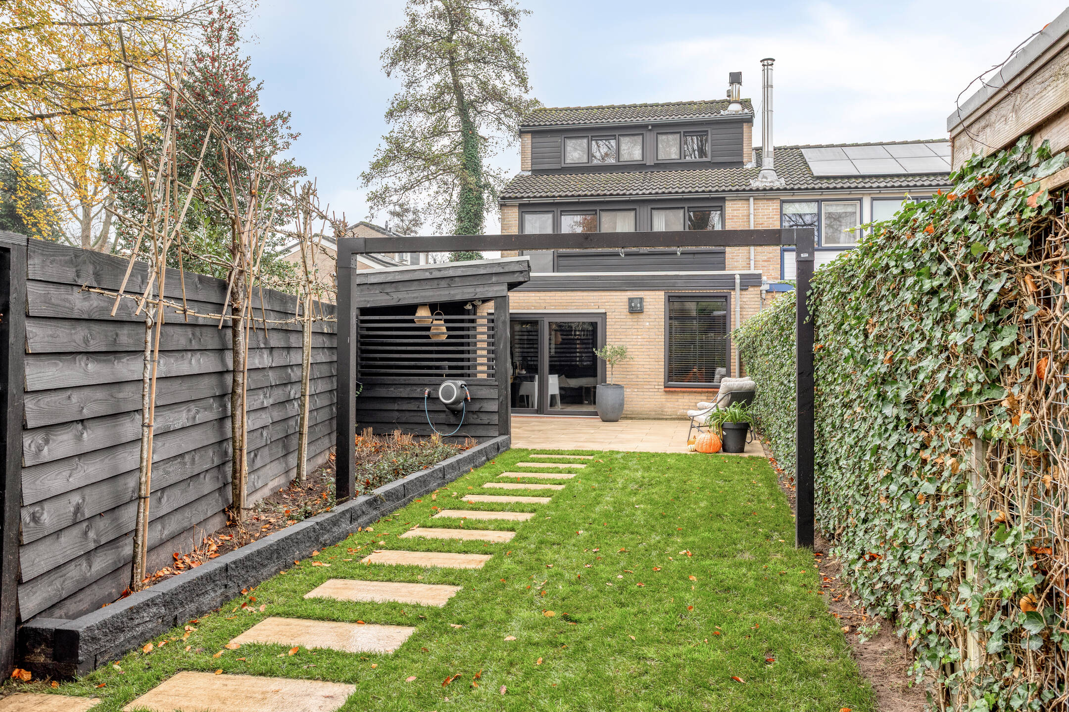 En die tuin? Die is in 2025 volledig vernieuwd en straalt luxe én rust uit. Een strak terras met keramische tegels, een fijne overkapping voor de lange zomeravonden, een praktische achterom en aan de zijkant nog extra bergruimte. Gelegen op het zonnige zuiden, met vrij uitzicht over het groen, is dit een heerlijke buitenkamer waar je het hele jaar door geniet.