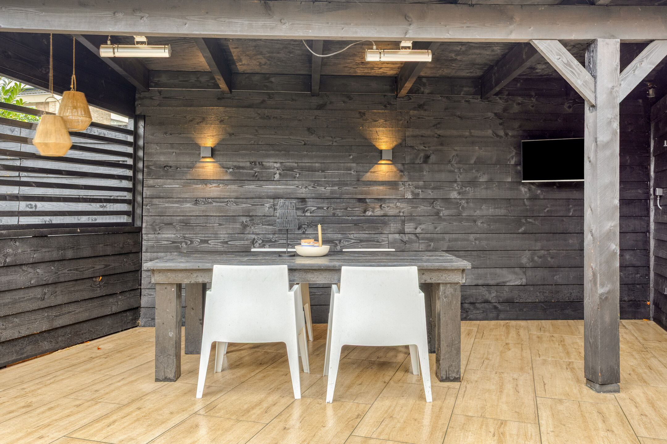 - Fraai aangelegd terras met keramische tegels, overkapping en achterom.