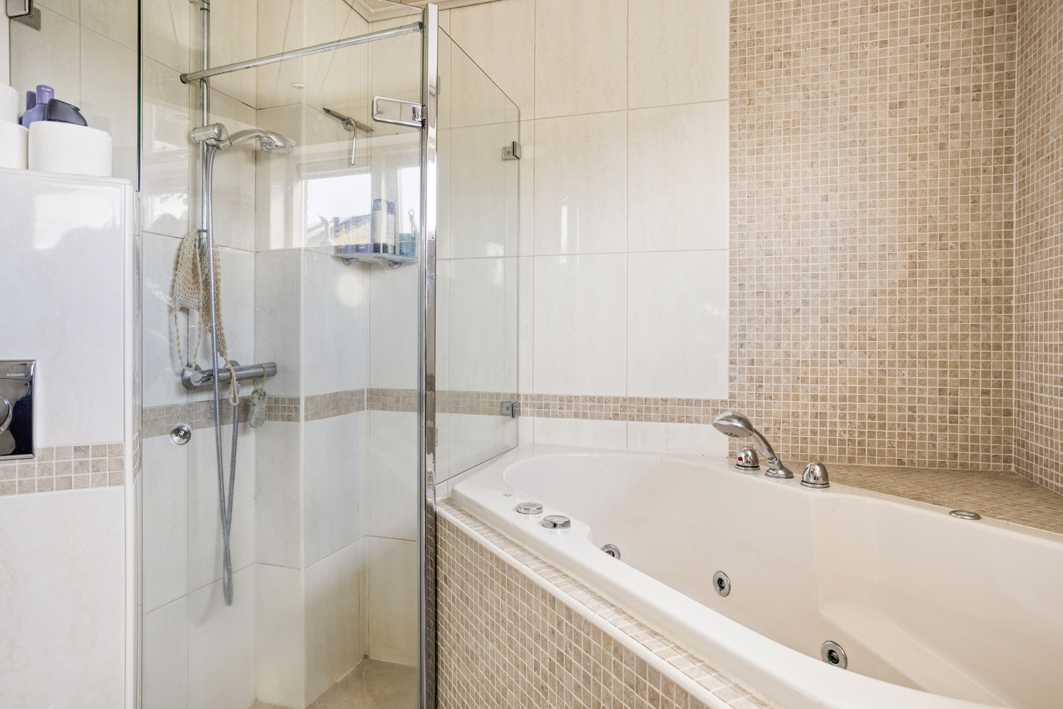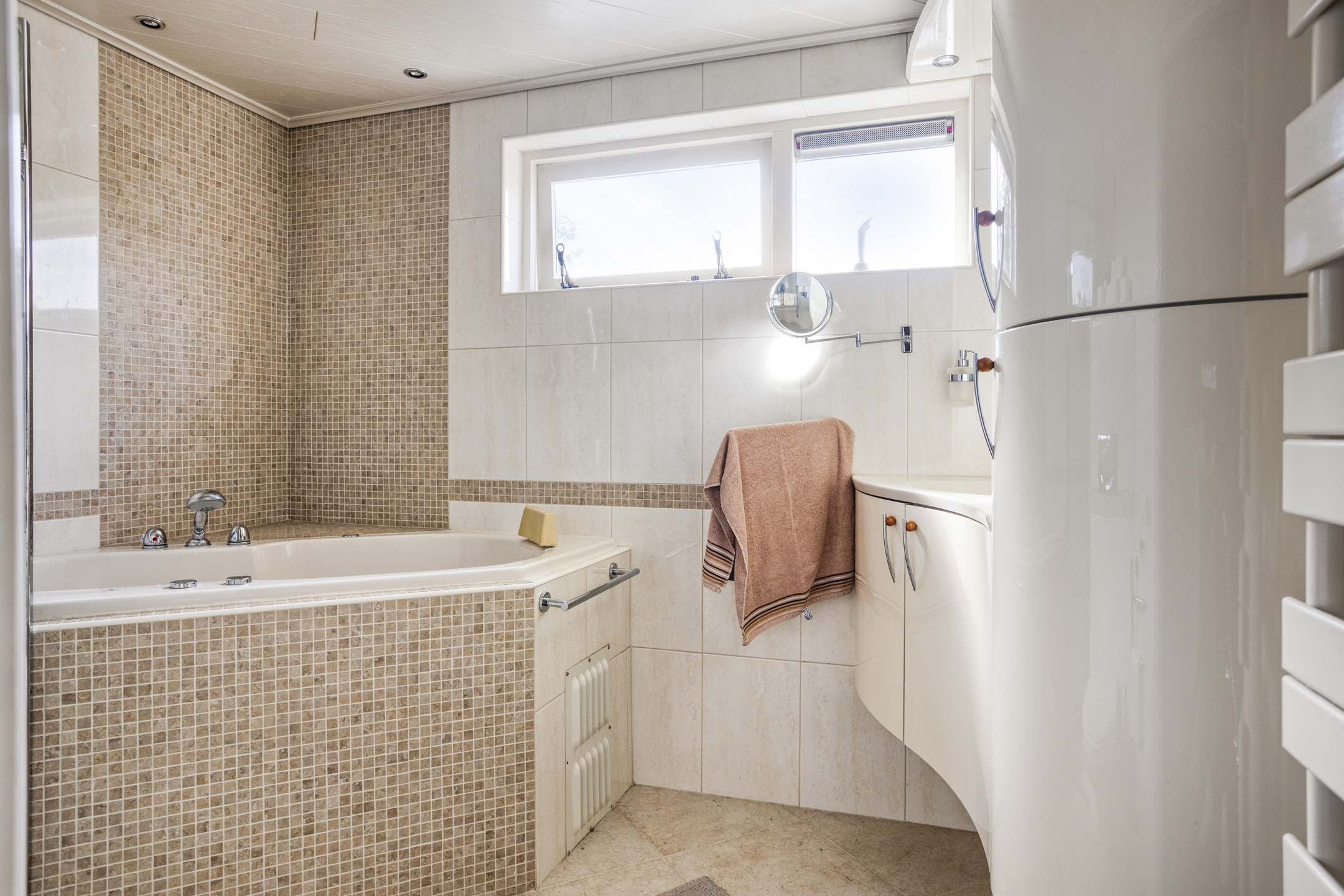 Op de eerste verdieping bevinden zich twee ruime slaapkamers, waarvan één met toegang tot een balkon. De oorspronkelijke derde slaapkamer is samengevoegd met de tweede, maar kan eenvoudig worden teruggebracht. De badkamer is comfortabel ingericht met een jacuzzi, een inloopdouche, een hangend toilet en een wastafelmeubel.