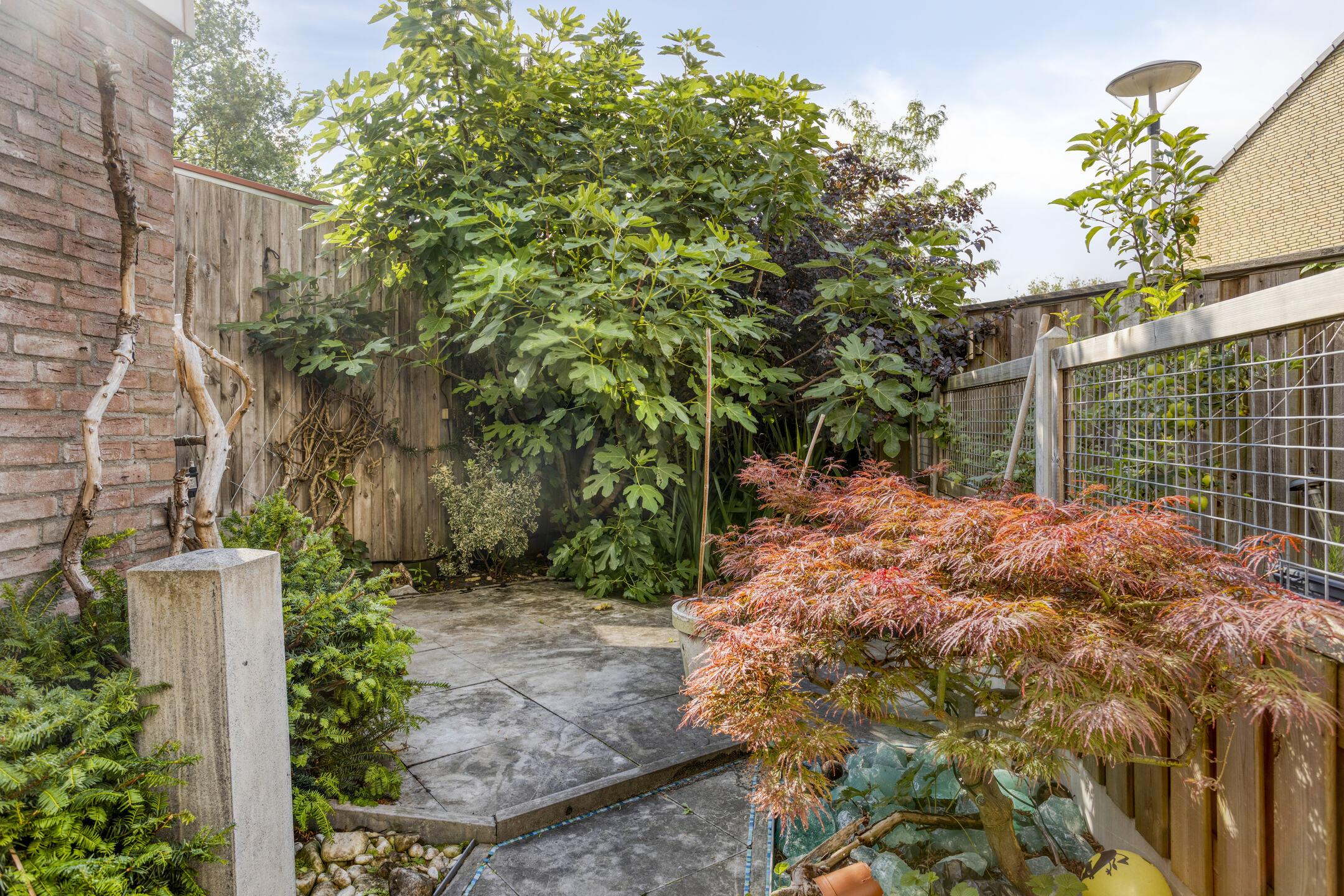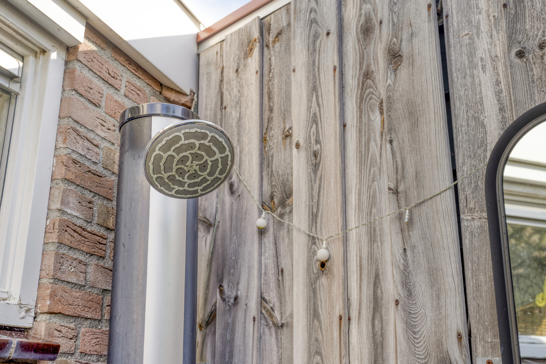 De achtertuin is gunstig gelegen op het zonnige zuidoosten en vormt een knusse en sfeervolle buitenruimte. Dankzij de fraaie terrasoverkapping geniet je hier in elk seizoen van het buitenleven, terwijl de buitendouche zorgt voor verfrissing op warme dagen.