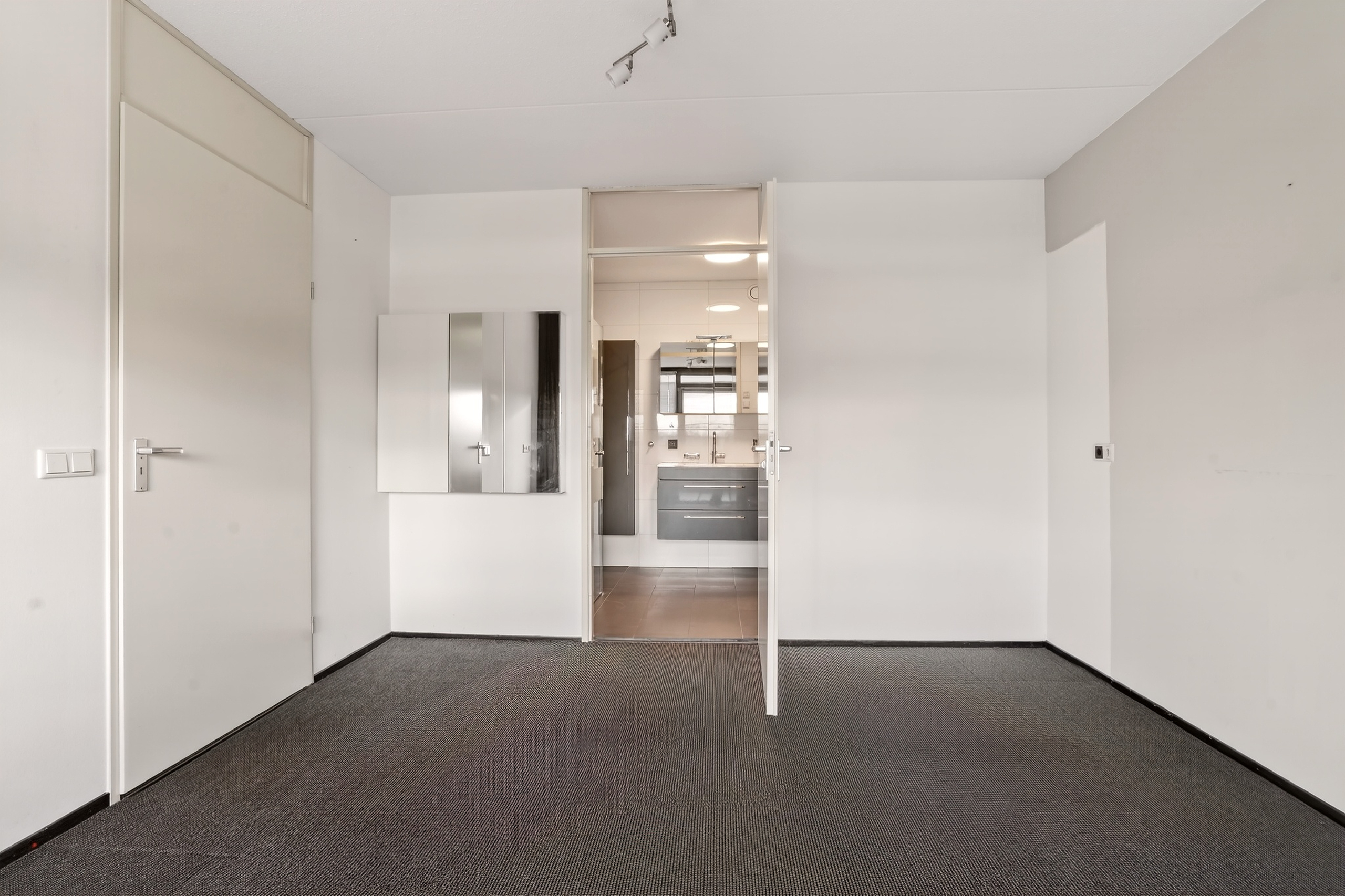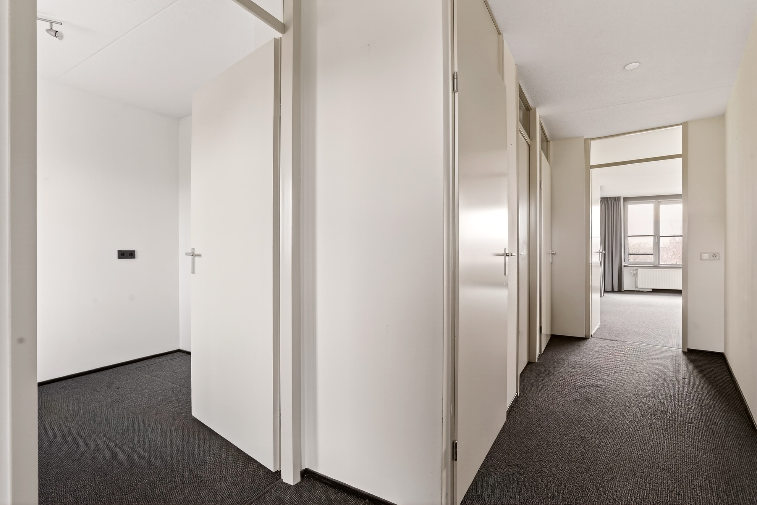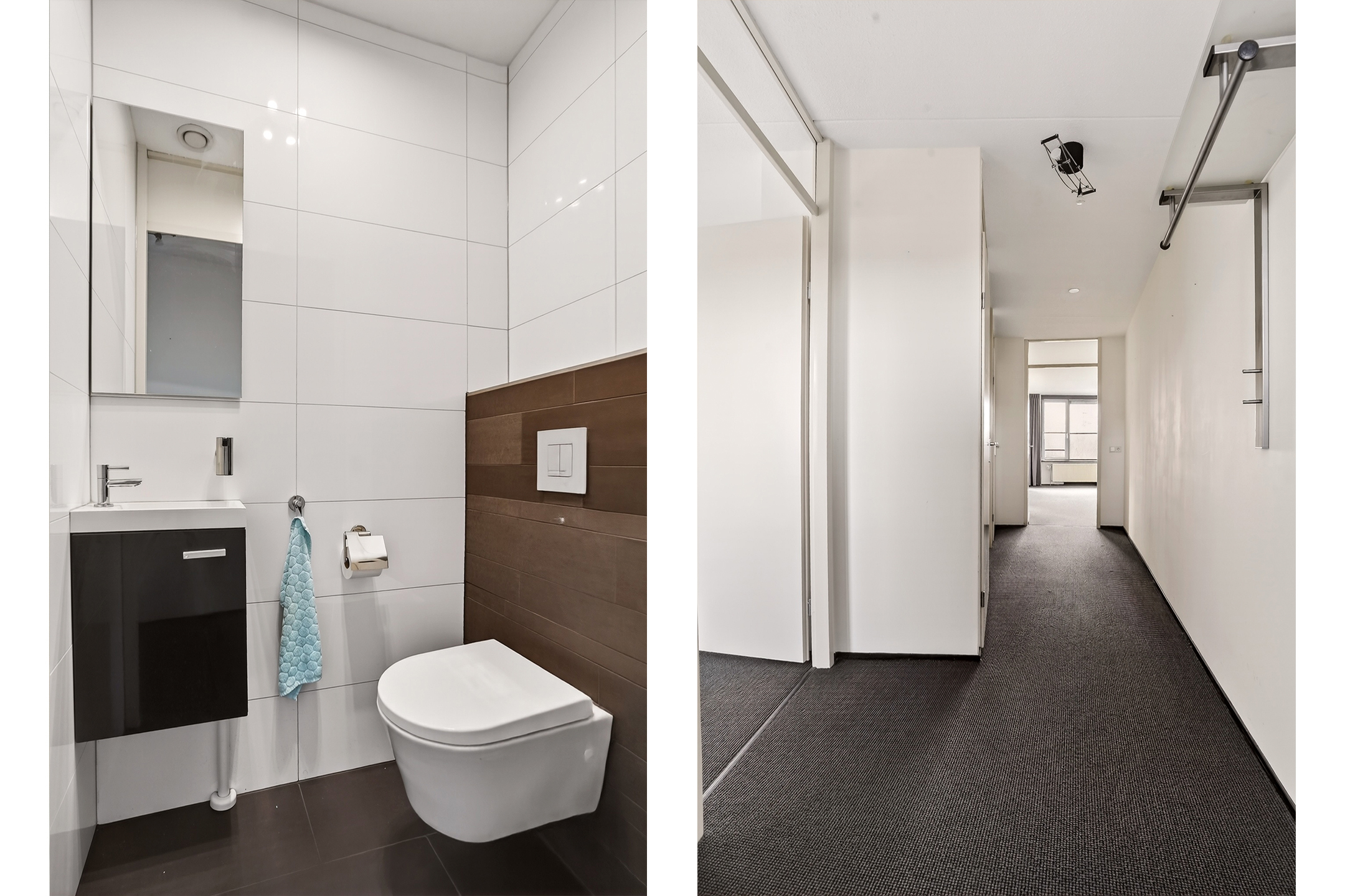 Eenmaal in het appartement kom je binnen in de hal met meterkast en een separaat toilet met fonteintje. Vanuit hier bereik je de eerste slaapkamer, perfect als logeer-, werk- of hobbykamer. De technische ruimte biedt plaats aan het witgoed en de mechanische ventilatie-unit en zorgt voor praktische bergruimte.