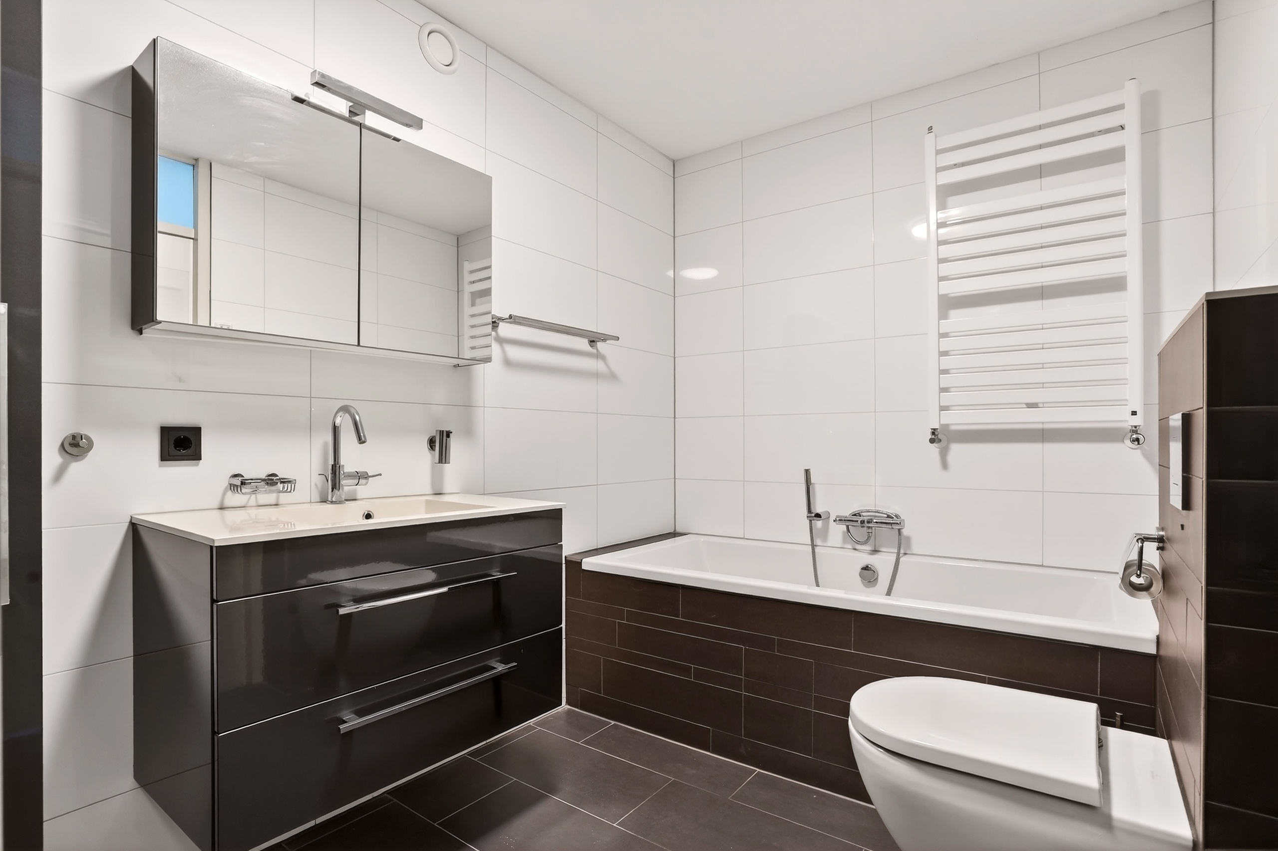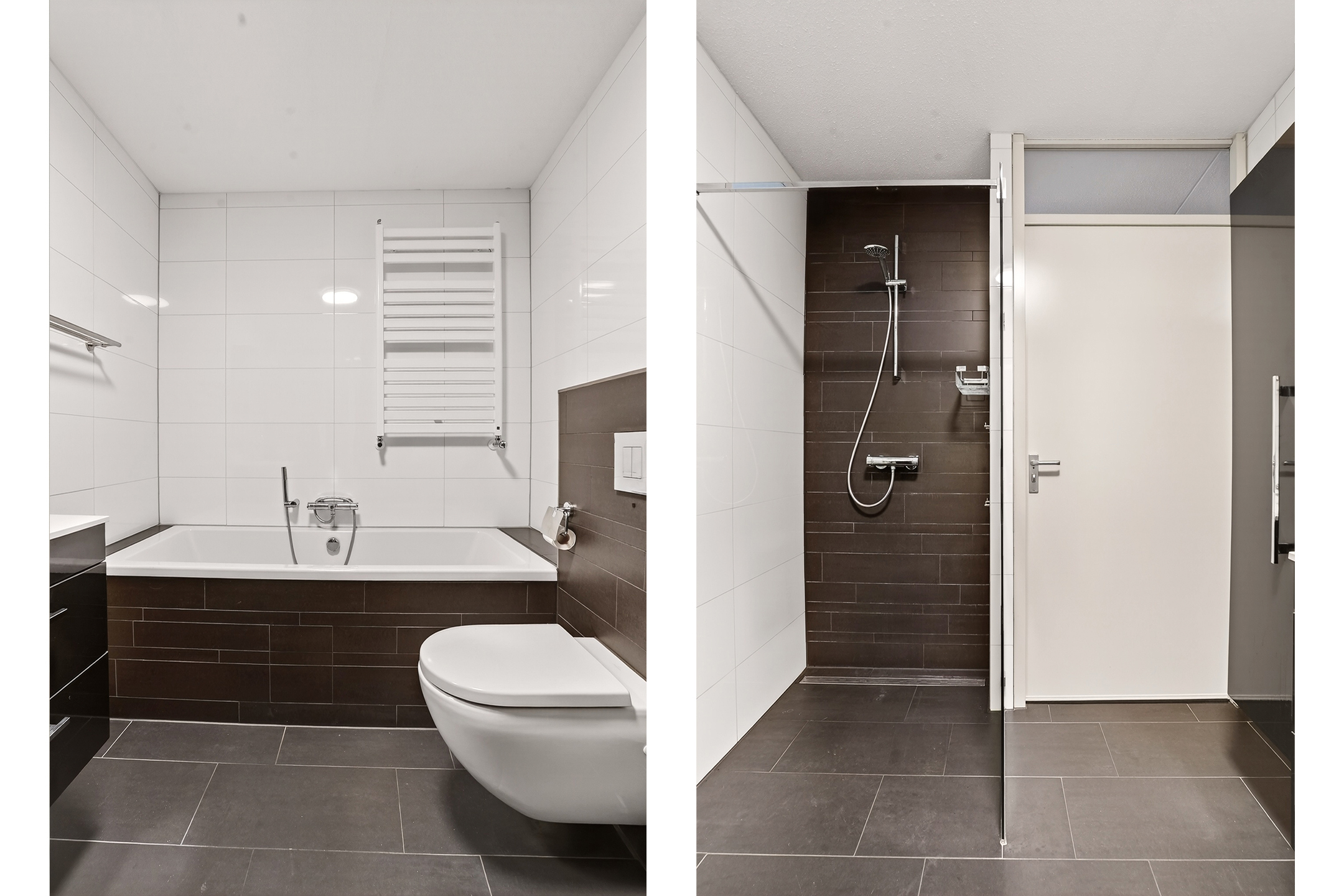 De royale badkamer is compleet uitgevoerd met een inloopdouche, ligbad, wastafelmeubel en een hangend toilet. De tweede slaapkamer heeft een bijzonder prettige ligging en biedt directe toegang de badkamer, een fijne combinatie van comfort en privacy.
