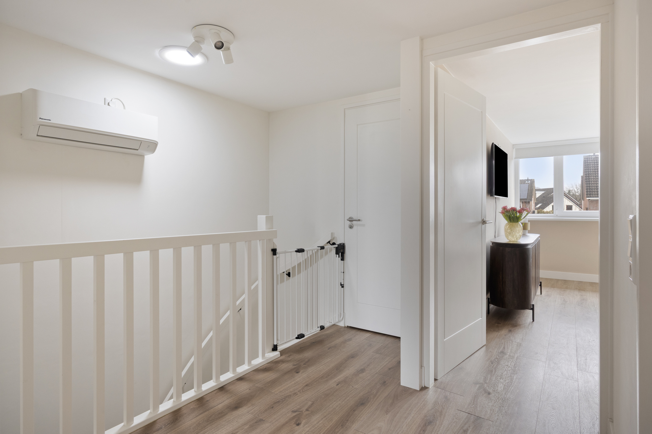 Overloop met airconditioning, badkamer met dakkapel, dubbele wastafel, inloopdouche en hangend toilet, inloopkast, drie ruime slaapkamers (één met dakkapel en drie met inbouwkasten).