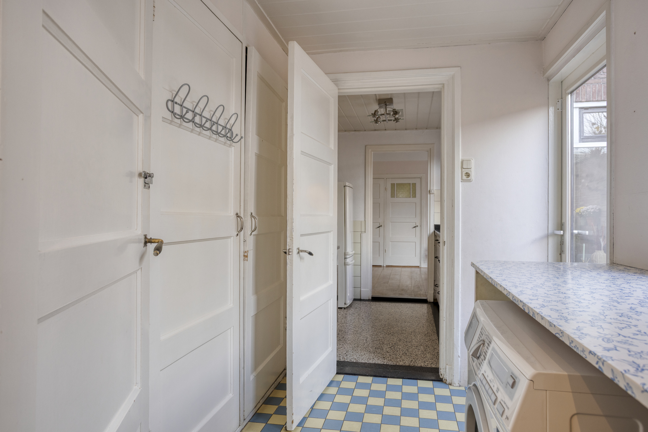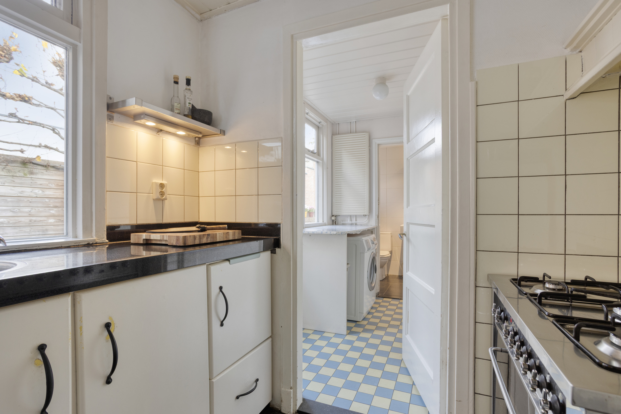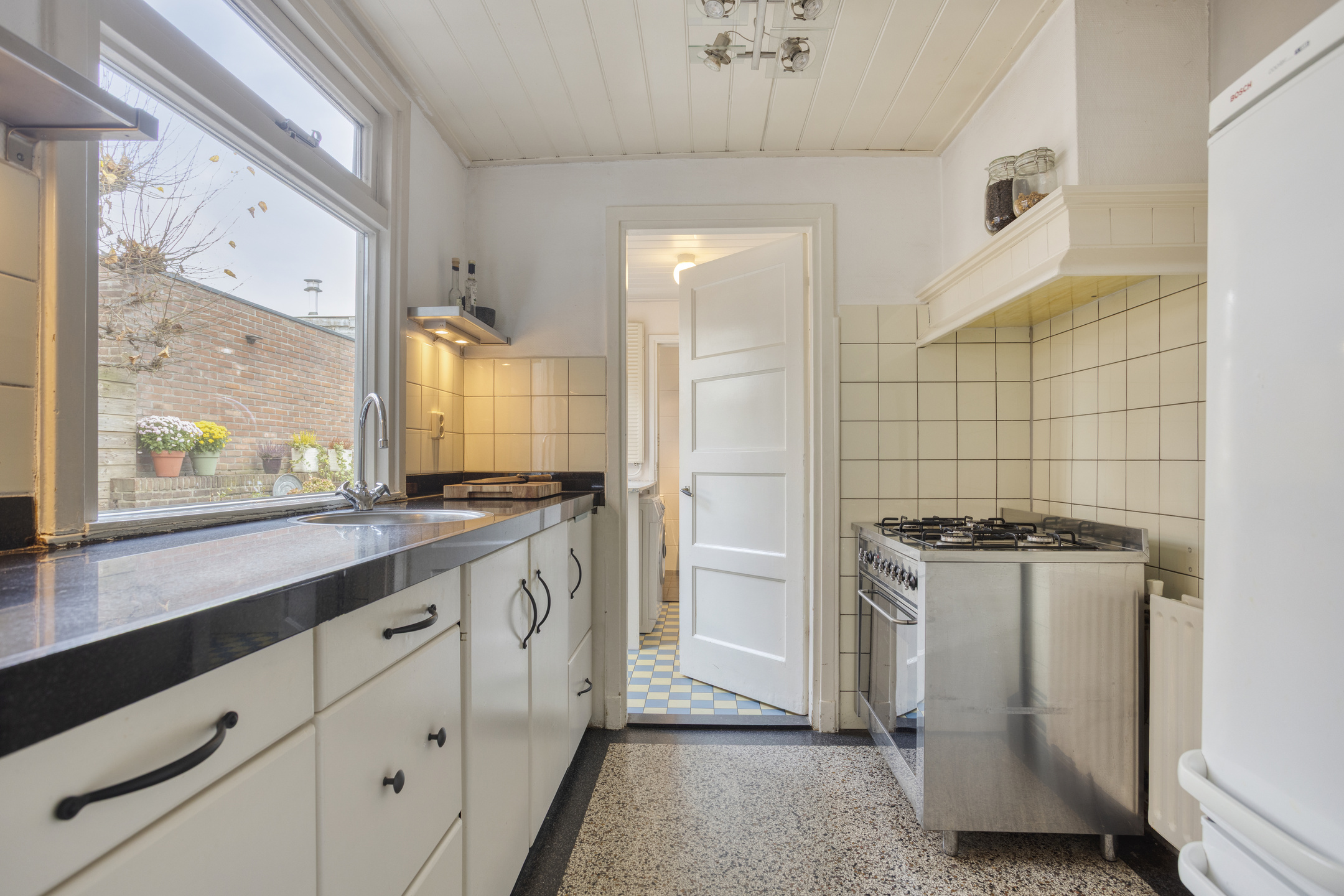 Op de begane grond betreed je de woning via een overdekte entree naar de hal met granitovloer, gestucte wanden en plafond, voorzien van een meterkast. De woonkamer ademt de jaren ’30-sfeer uit met parketvloer, een kelderkast en en-suite deuren. De dichte keuken is gedateerd maar functioneel, met een granitovloer. Vanuit de bijkeuken met inbouwkast en opstelplaats voor HR-combiketel, heb je toegang tot de tuin. De badkamer is voorzien van een inloopdouche, staand toilet en wastafel.