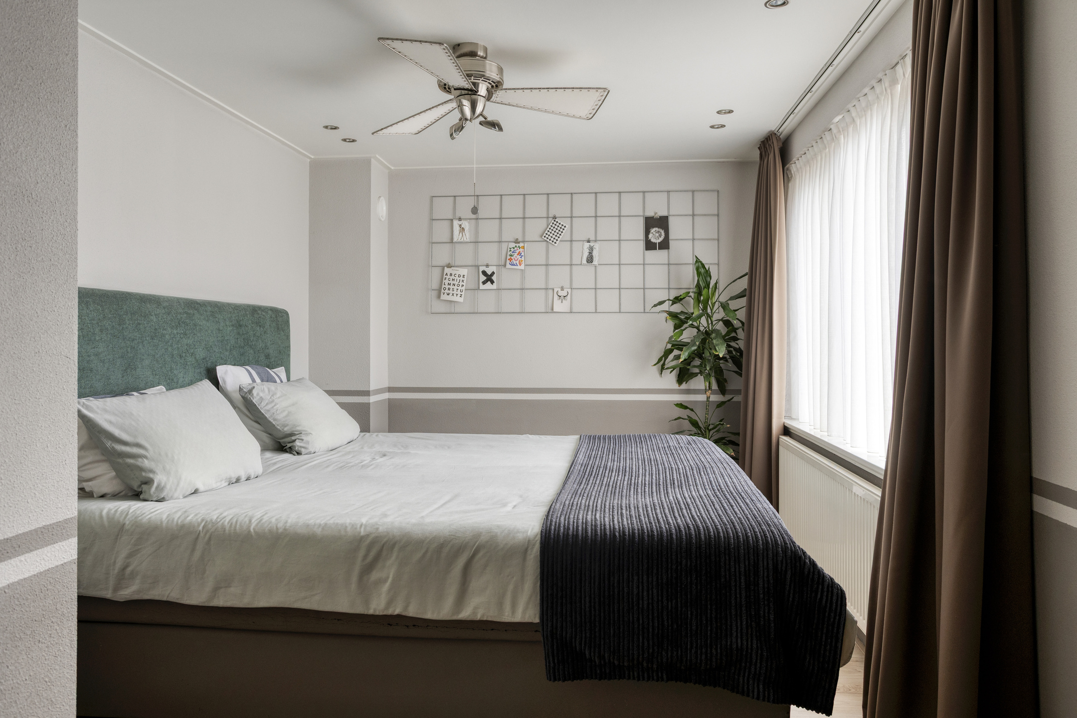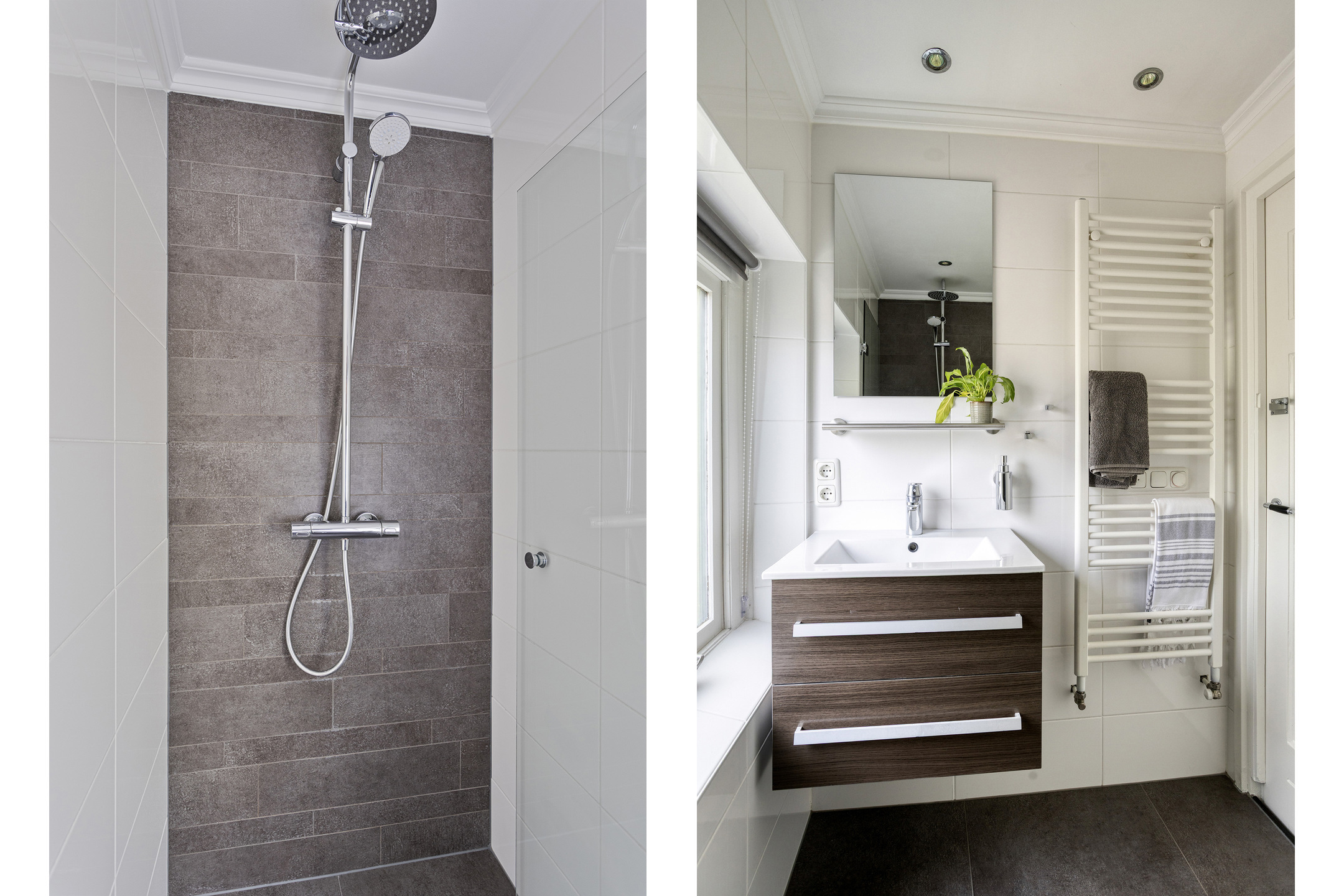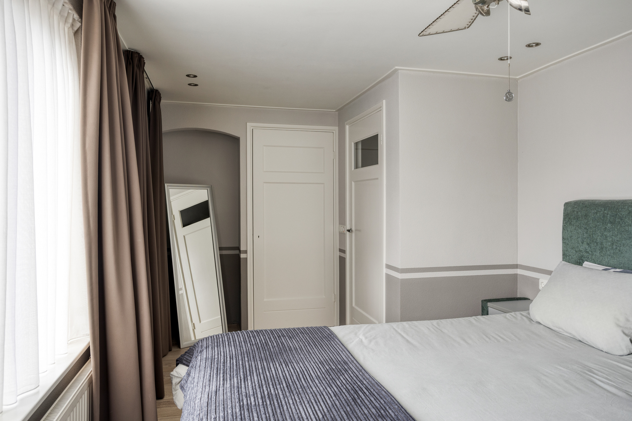 De eerste verdieping telt twee slaapkamers met vaste inbouwkasten. In één slaapkamer is de witgoedaansluiting netjes in de kast verwerkt, terwijl de andere slaapkamer nog extra beschikt over een inloopkast. De moderne badkamer is voorzien van een inloopdouche en een stijlvol wastafelmeubel. Via een vlizotrap is de tweede verdieping bereikbaar, waar zich een praktische bergzolder met dakraam en de cv-opstelling bevindt.