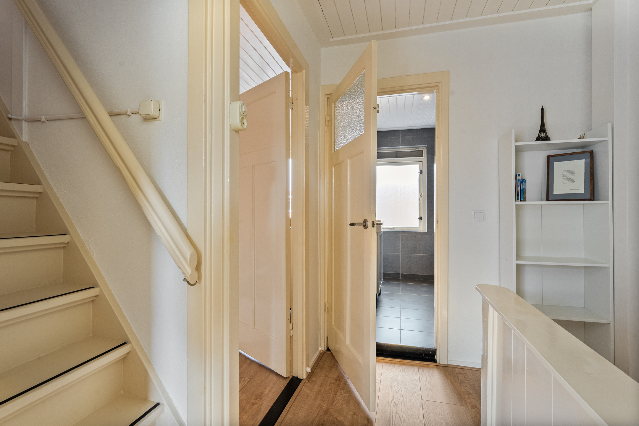 De overloop biedt toegang tot twee ruime slaapkamers, beide gestuct en voorzien van nieuwe vloeren. De badkamer beschikt over een recent geplaatste douchecabine, wastafel met meubel, hangend toilet en designradiator.
