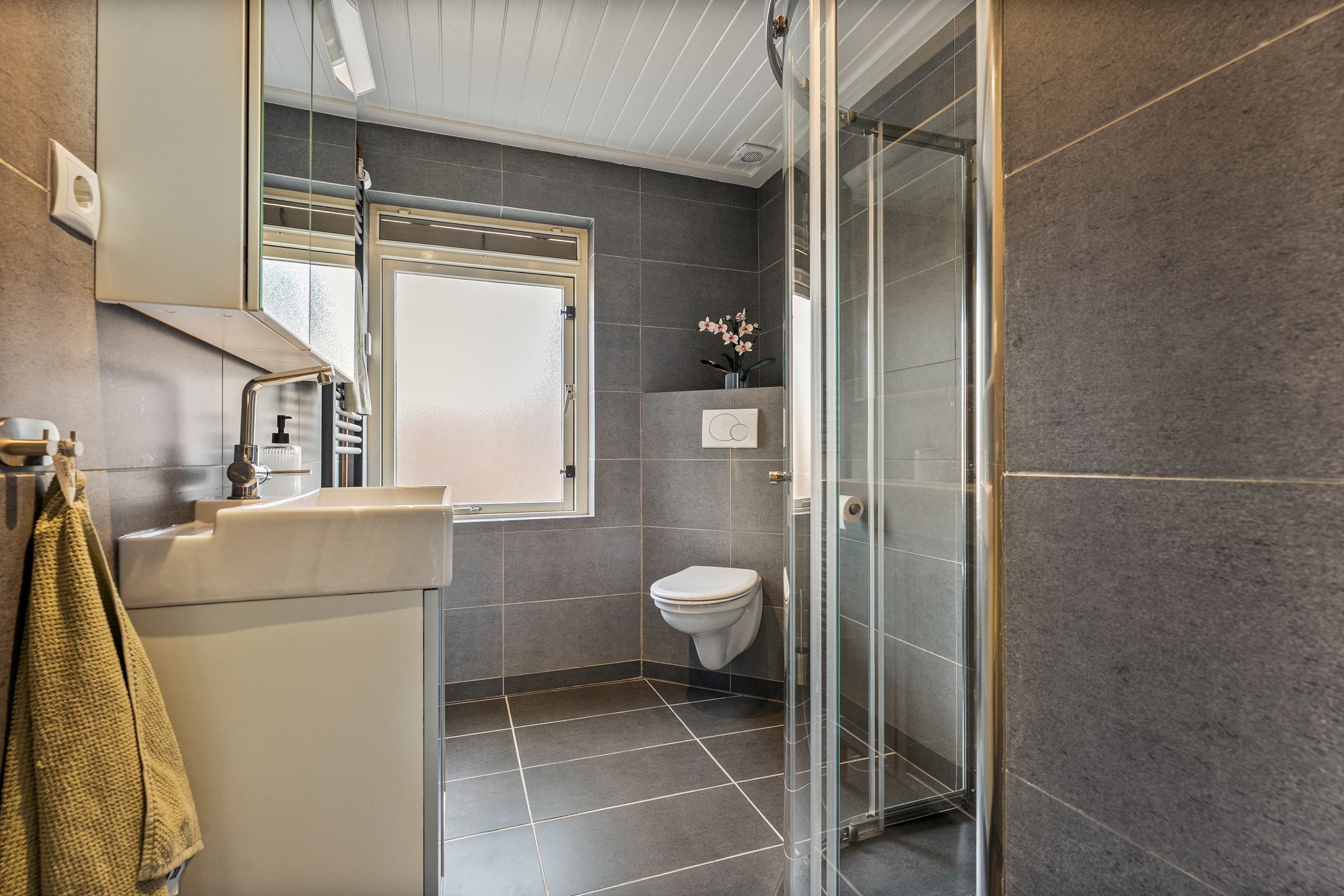 - Nette badkamer met recent geplaatste douchecabine, wastafelmeubel, hangend toilet en designradiator.
