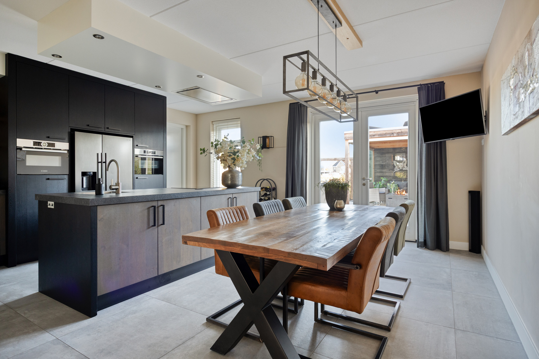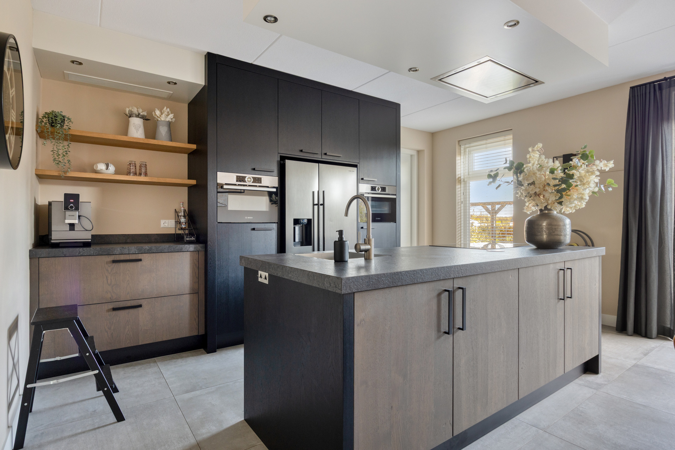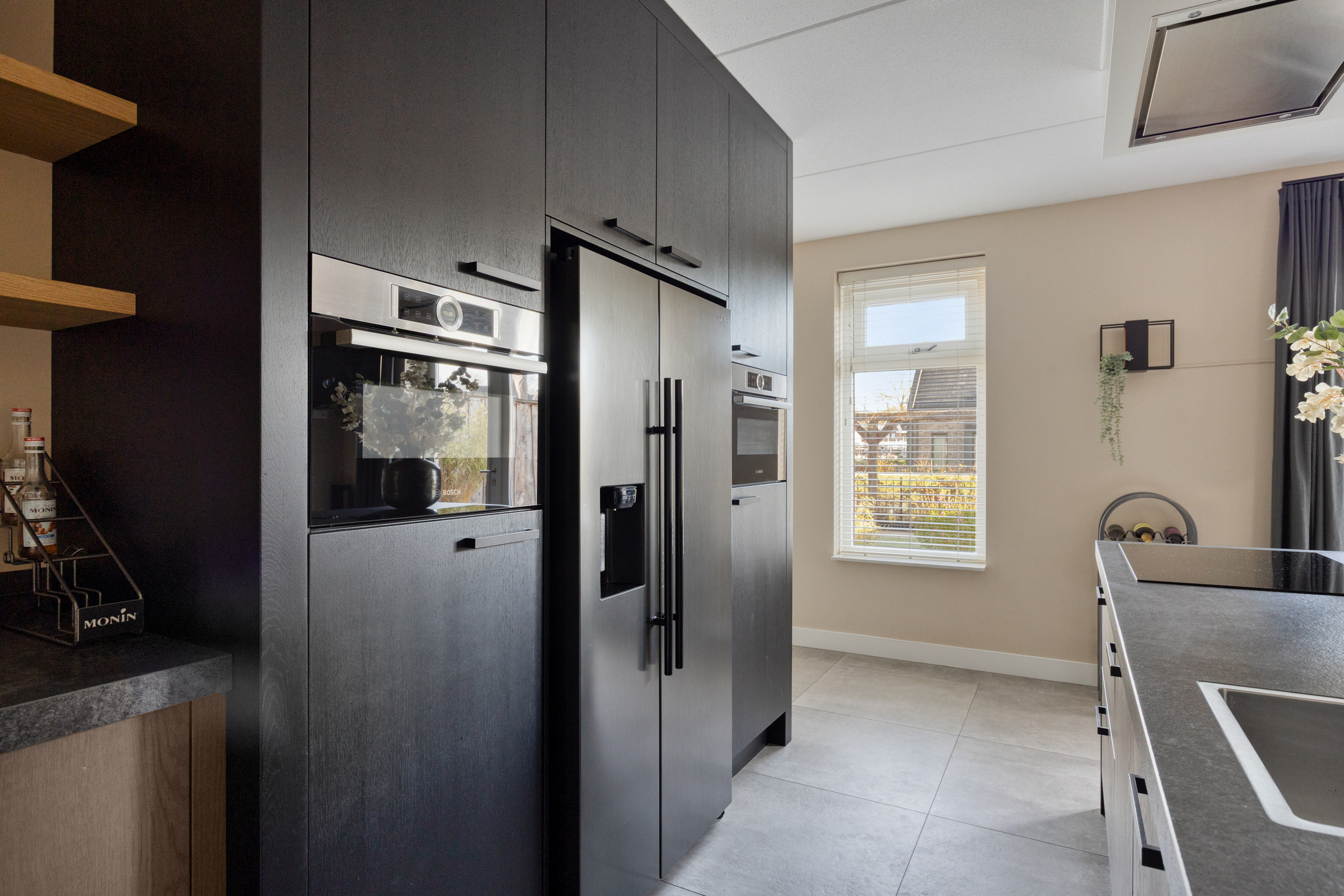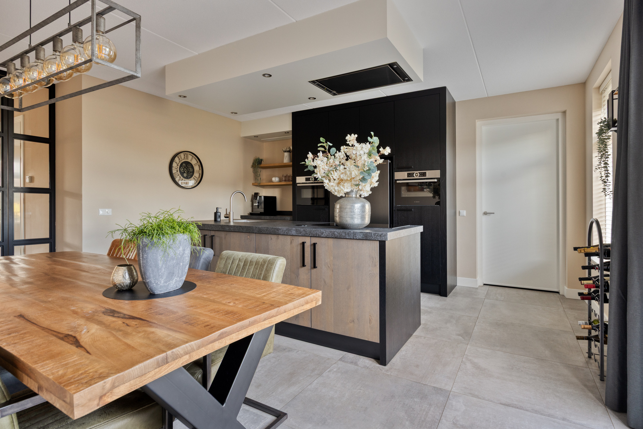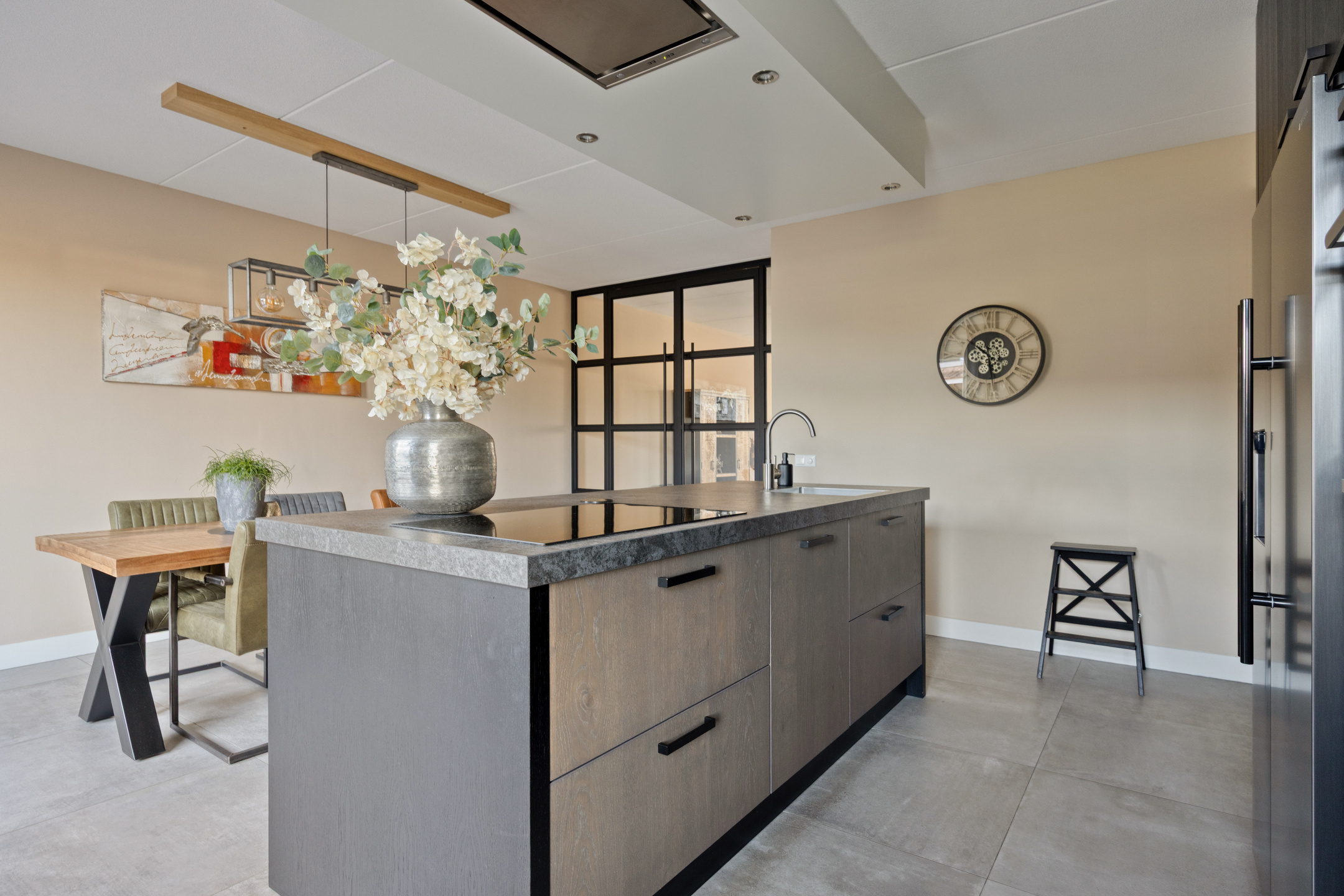 Bij binnenkomst bevind je je in een ruime woonkamer met een grote erker. Tussen de woonkamer en woonkeuken zijn grote taatsdeuren geplaatst, waardoor je de ruimtes kan afsluiten maar er ook een grote open ruimte van kan maken. De moderne woonkeuken met kookeiland en hoogwaardige apparatuur heeft prachtig uitzicht op de tuin en biedt ruimte voor een grote eettafel voor lange dinersessies. Met geopende tuindeuren kan in de zomer moeiteloos één geheel met de tuin worden gecreëerd. Vanuit hier bereik je ook de praktische bijkeuken met de wasmachine aansluiting en de aangebouwde stenen garage.