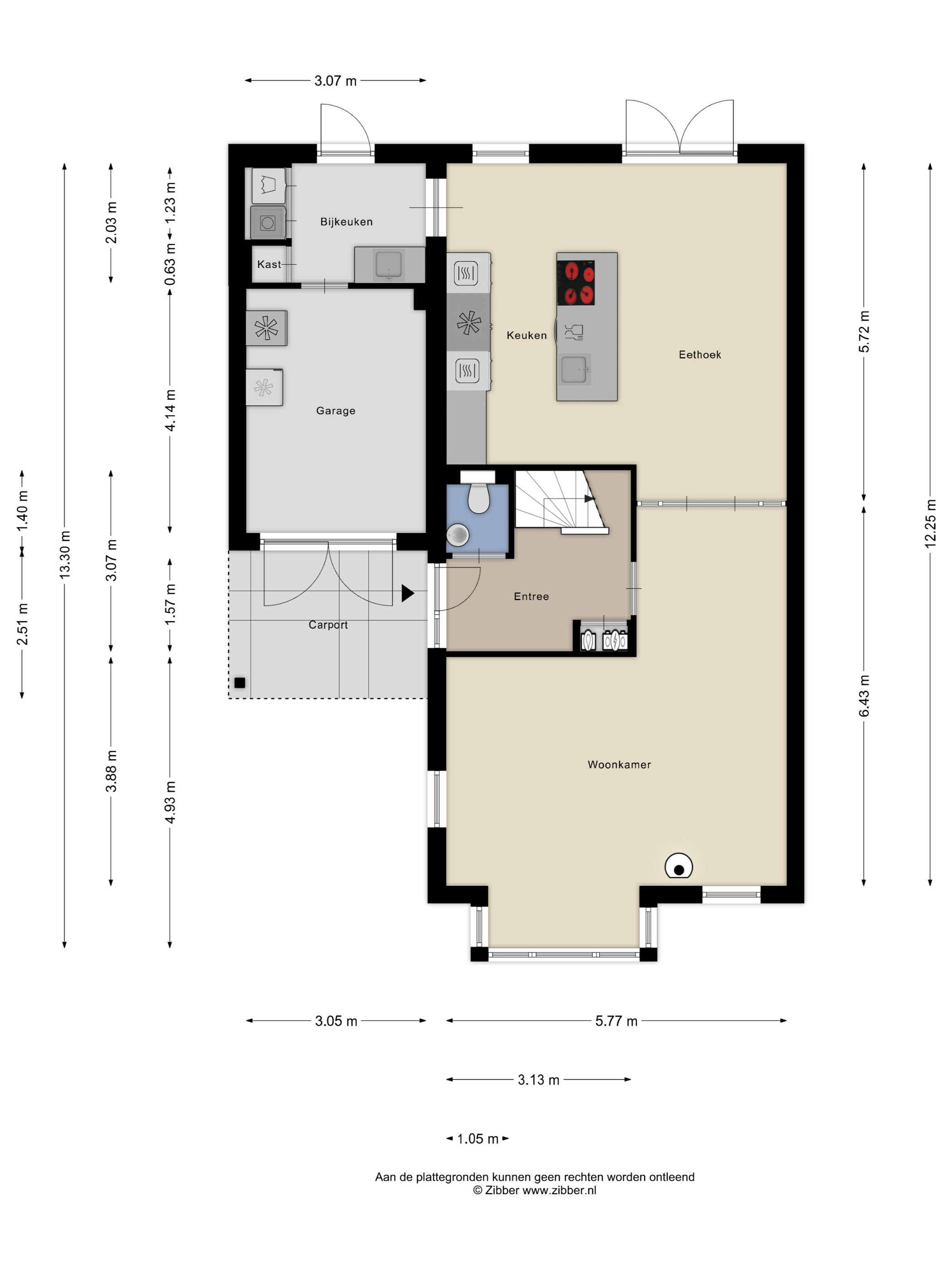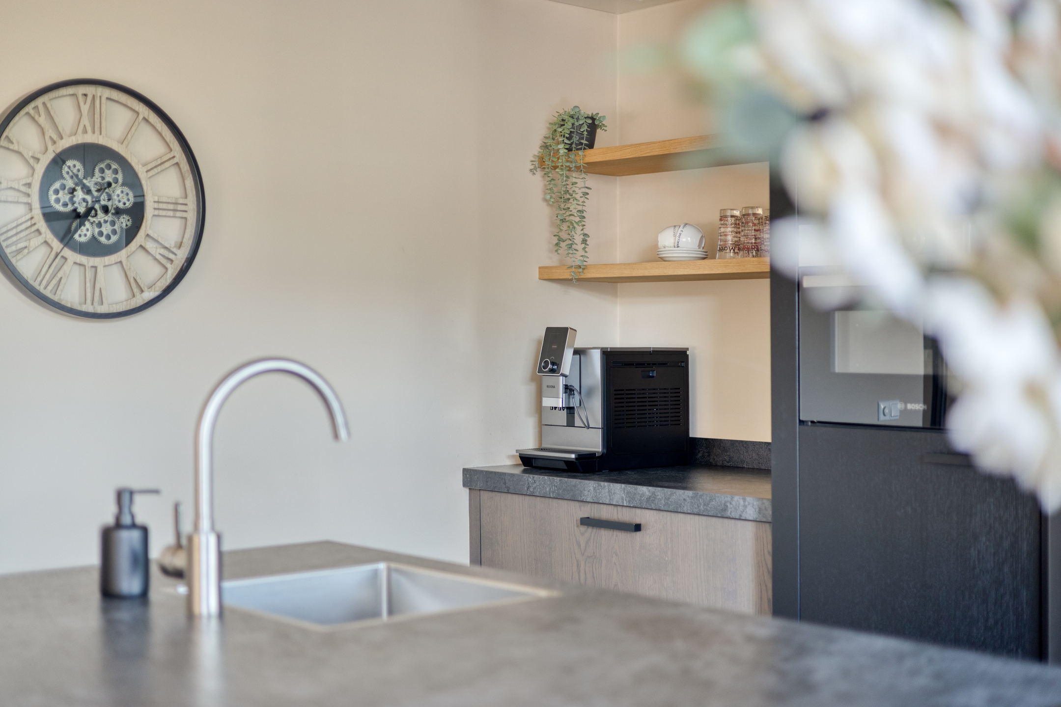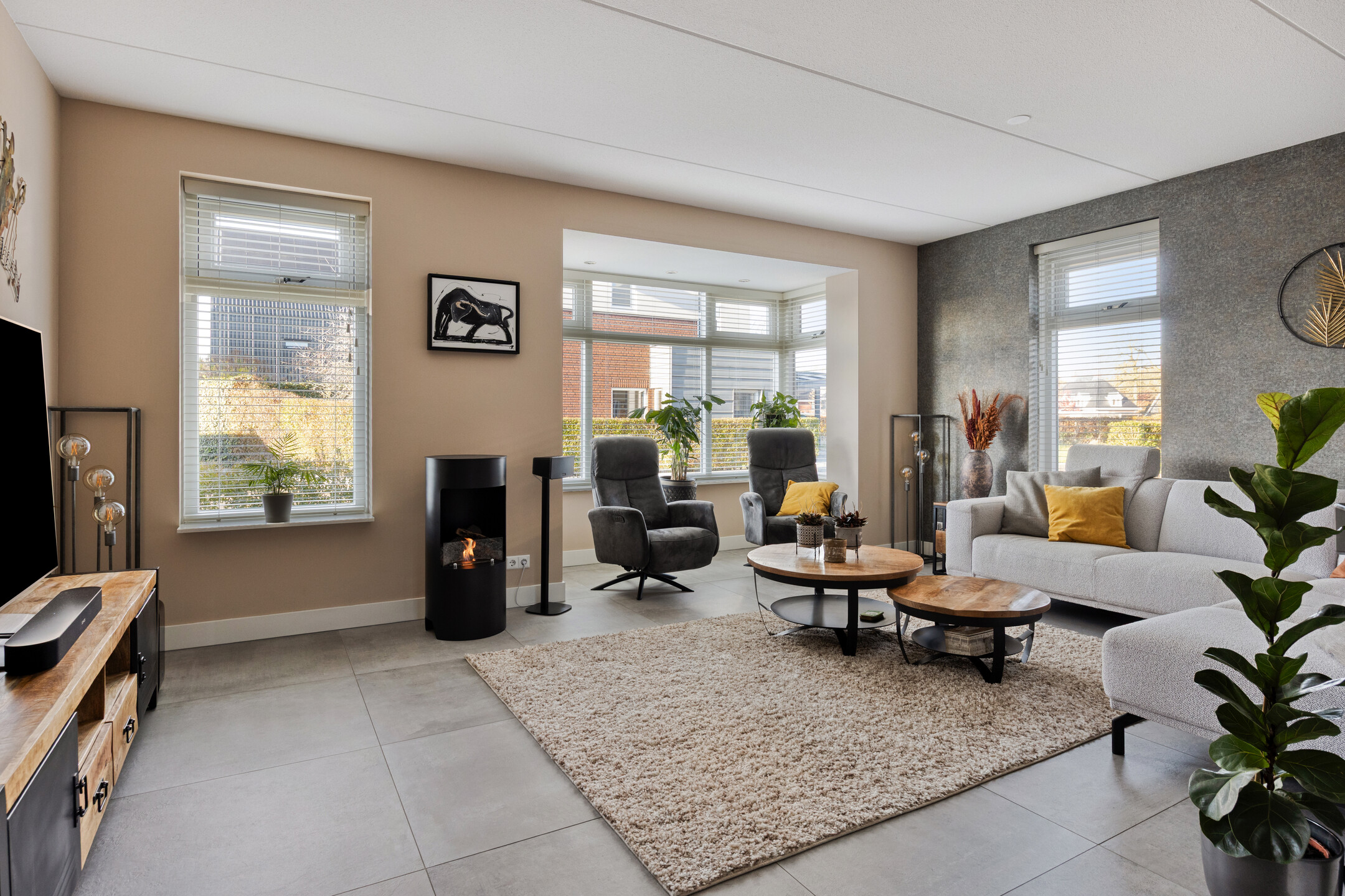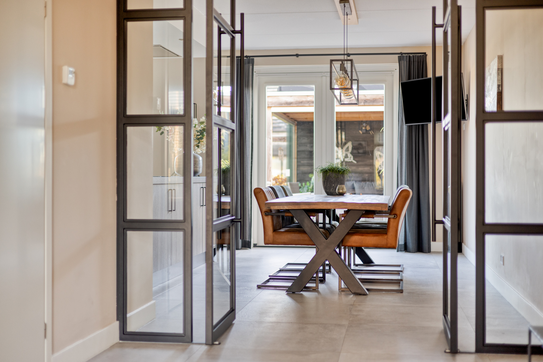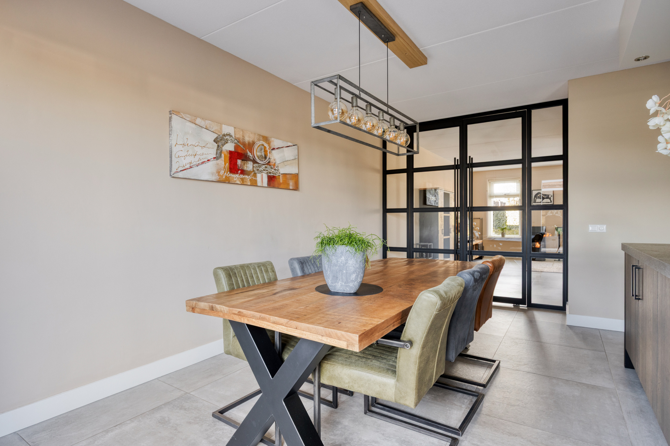 Bij binnenkomst bevind je je in een ruime woonkamer met een grote erker. Tussen de woonkamer en woonkeuken zijn grote taatsdeuren geplaatst, waardoor je de ruimtes kan afsluiten maar er ook een grote open ruimte van kan maken. De moderne woonkeuken met kookeiland en hoogwaardige apparatuur heeft prachtig uitzicht op de tuin en biedt ruimte voor een grote eettafel voor lange dinersessies. Met geopende tuindeuren kan in de zomer moeiteloos één geheel met de tuin worden gecreëerd. Vanuit hier bereik je ook de praktische bijkeuken met de wasmachine aansluiting en de aangebouwde stenen garage.