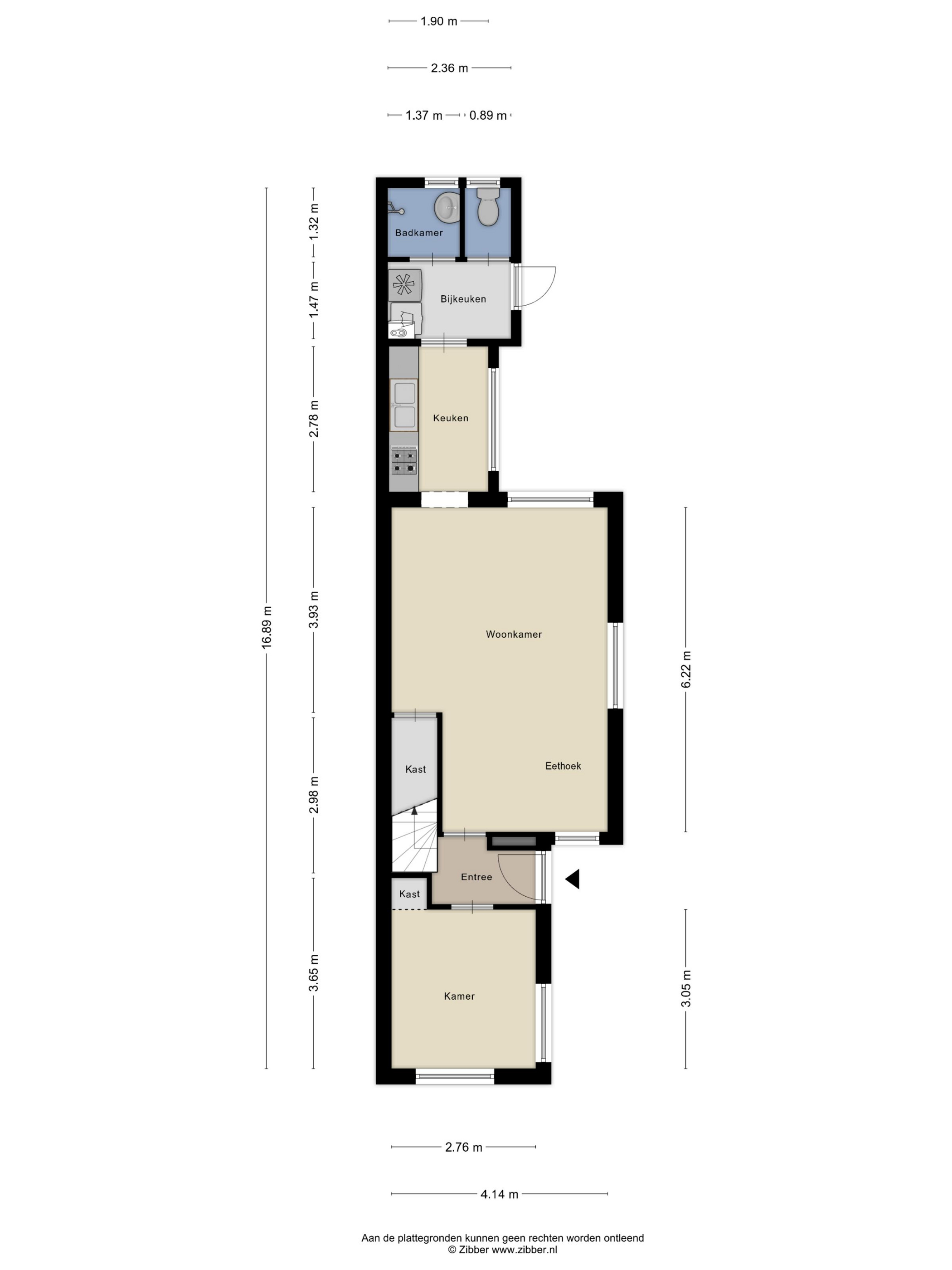Op de begane grond vind je een zij-entree, een hal met trapopgang en een slaap-/voorkamer met vaste kast. De ruime woonkamer is voorzien van een kelderkast en biedt toegang tot een dichte keuken met inbouwapparatuur. Vanuit de bijkeuken met opstelplaats voor witgoed en CV-ketel loop je zo de achtertuin in. Verder is er een separaat toilet en een badkamer met inloopdouche en wastafel.