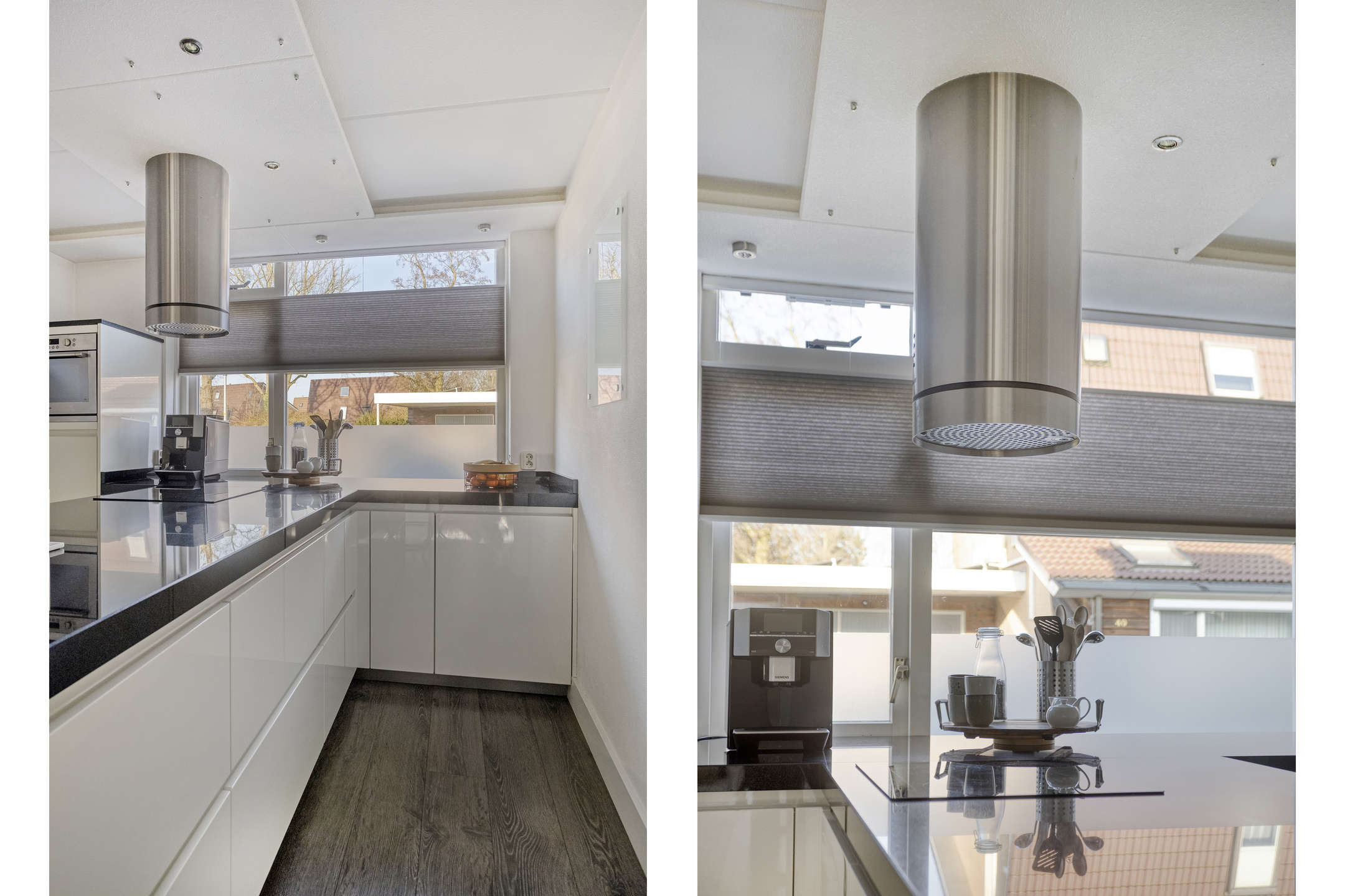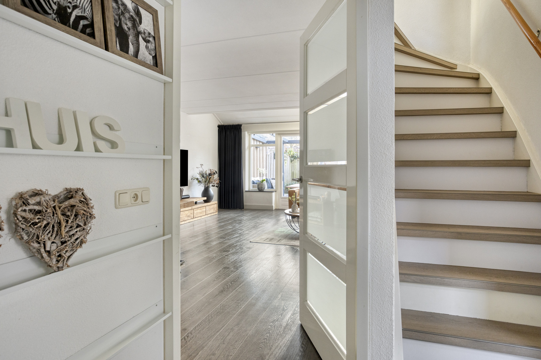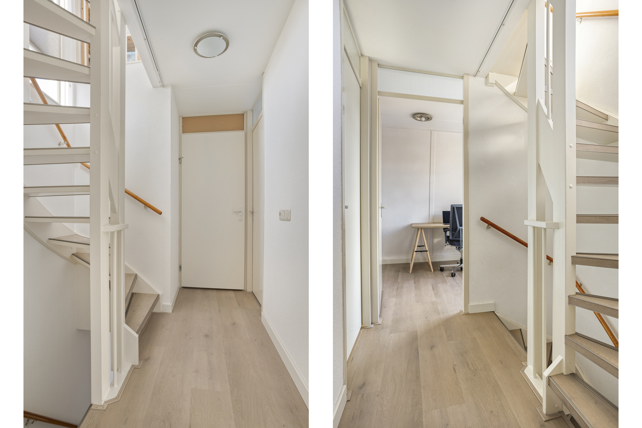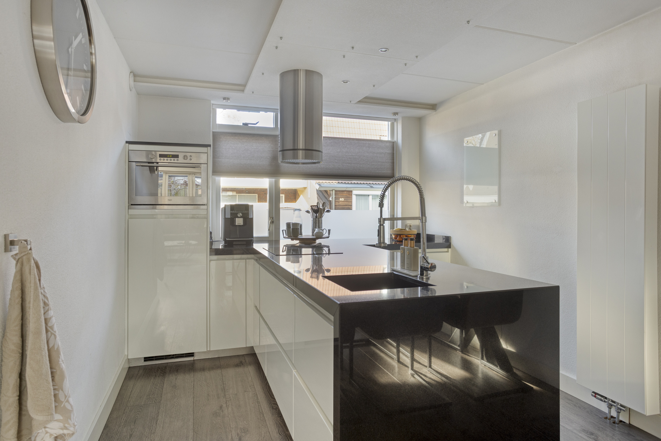 De begane grond verwelkomt je via de overdekte zij-entree in een hal met bijkeuken, trapopgang, meterkast, vaste kast en toilet met fontein. De straatgerichte open keuken met moderne inbouwapparatuur vormt het hart van het huis, terwijl de tuingerichte woonkamer met openslaande tuindeuren en dakraam een prachtige verbinding met de tuin creëert.