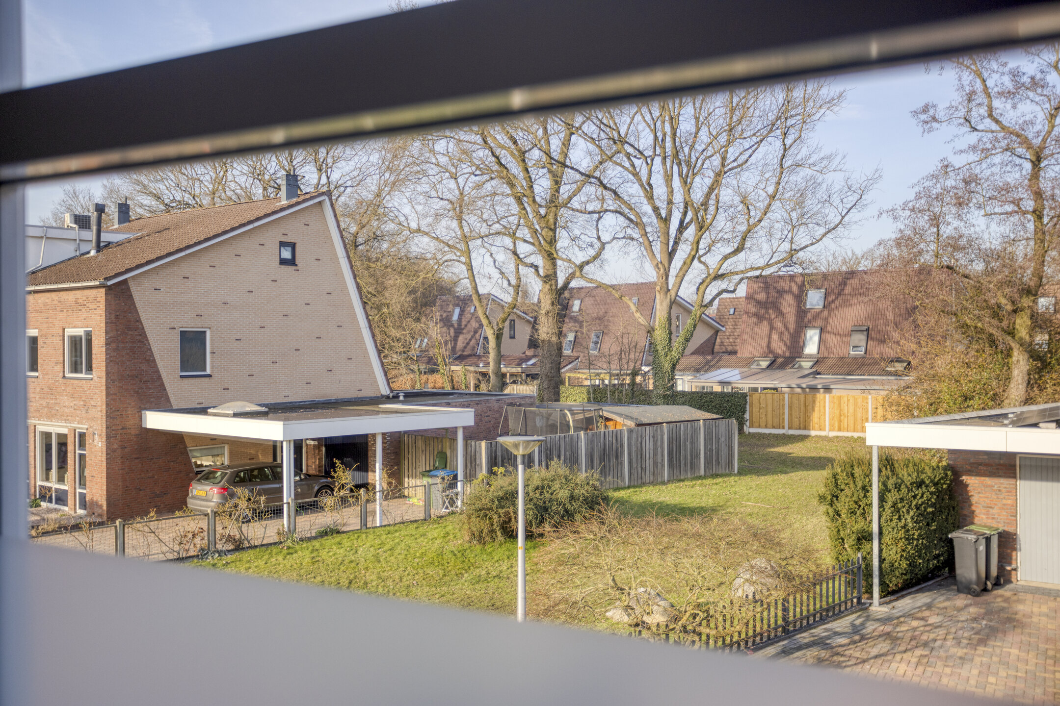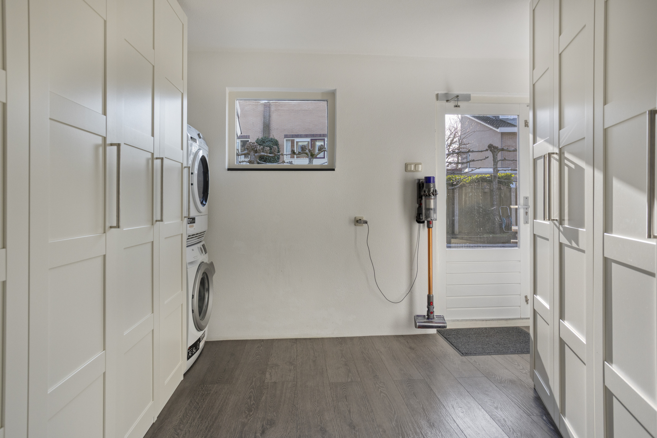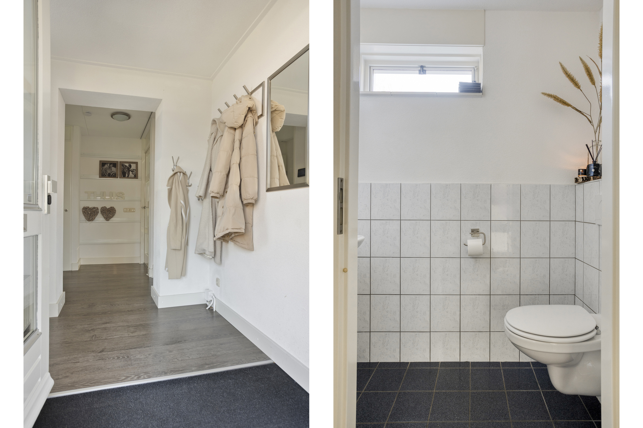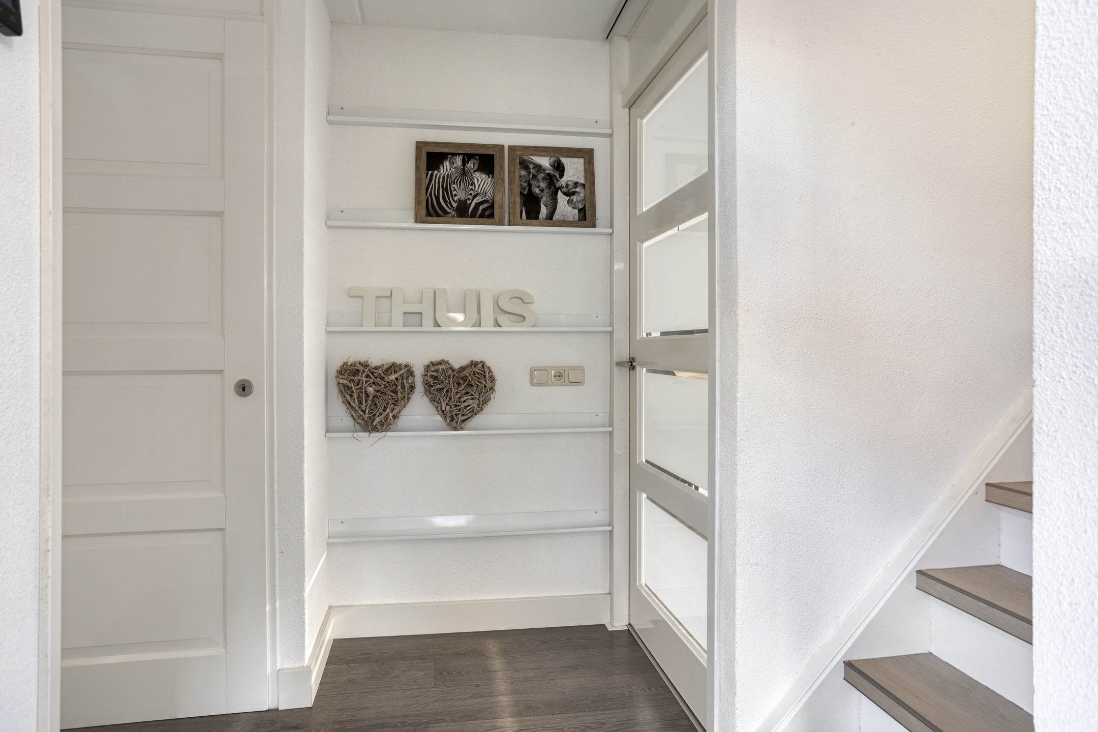 De begane grond verwelkomt je via de overdekte zij-entree in een hal met bijkeuken, trapopgang, meterkast, vaste kast en toilet met fontein. De straatgerichte open keuken met moderne inbouwapparatuur vormt het hart van het huis, terwijl de tuingerichte woonkamer met openslaande tuindeuren en dakraam een prachtige verbinding met de tuin creëert.