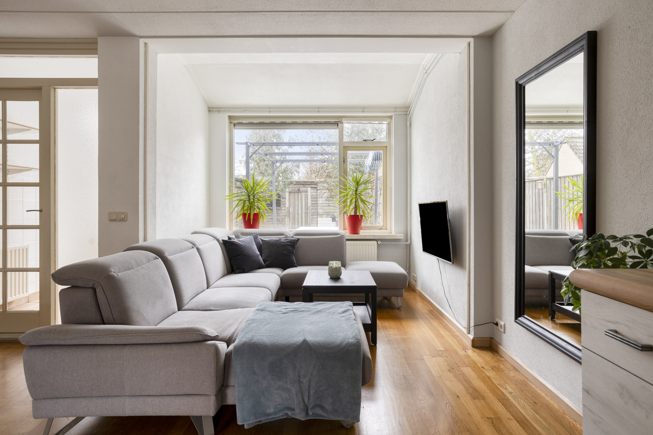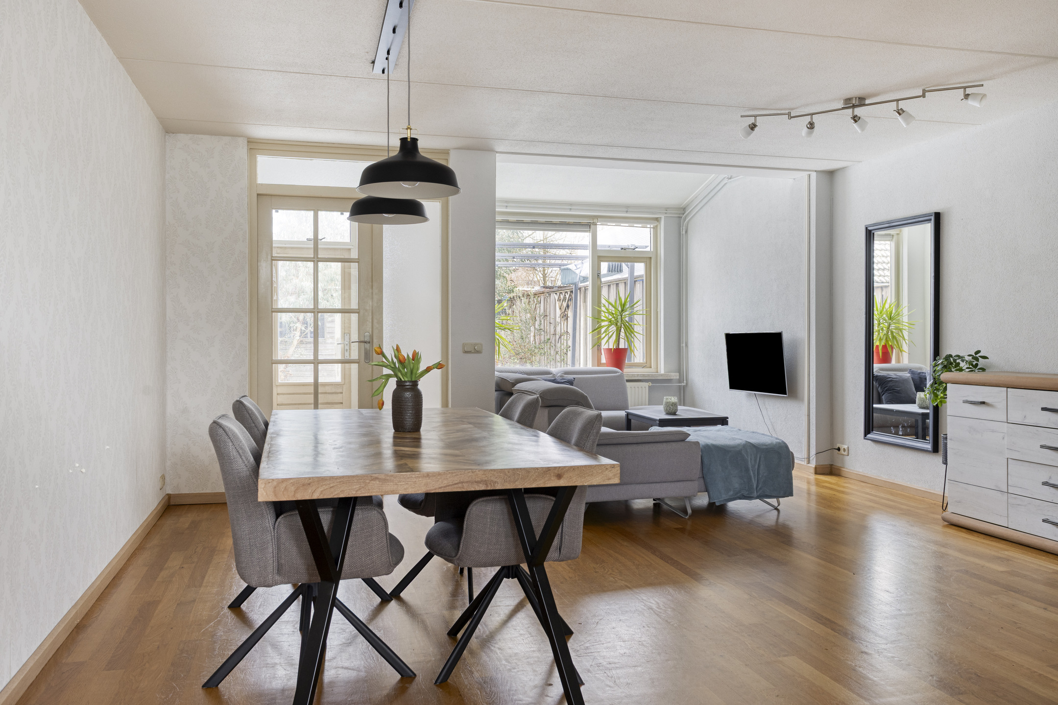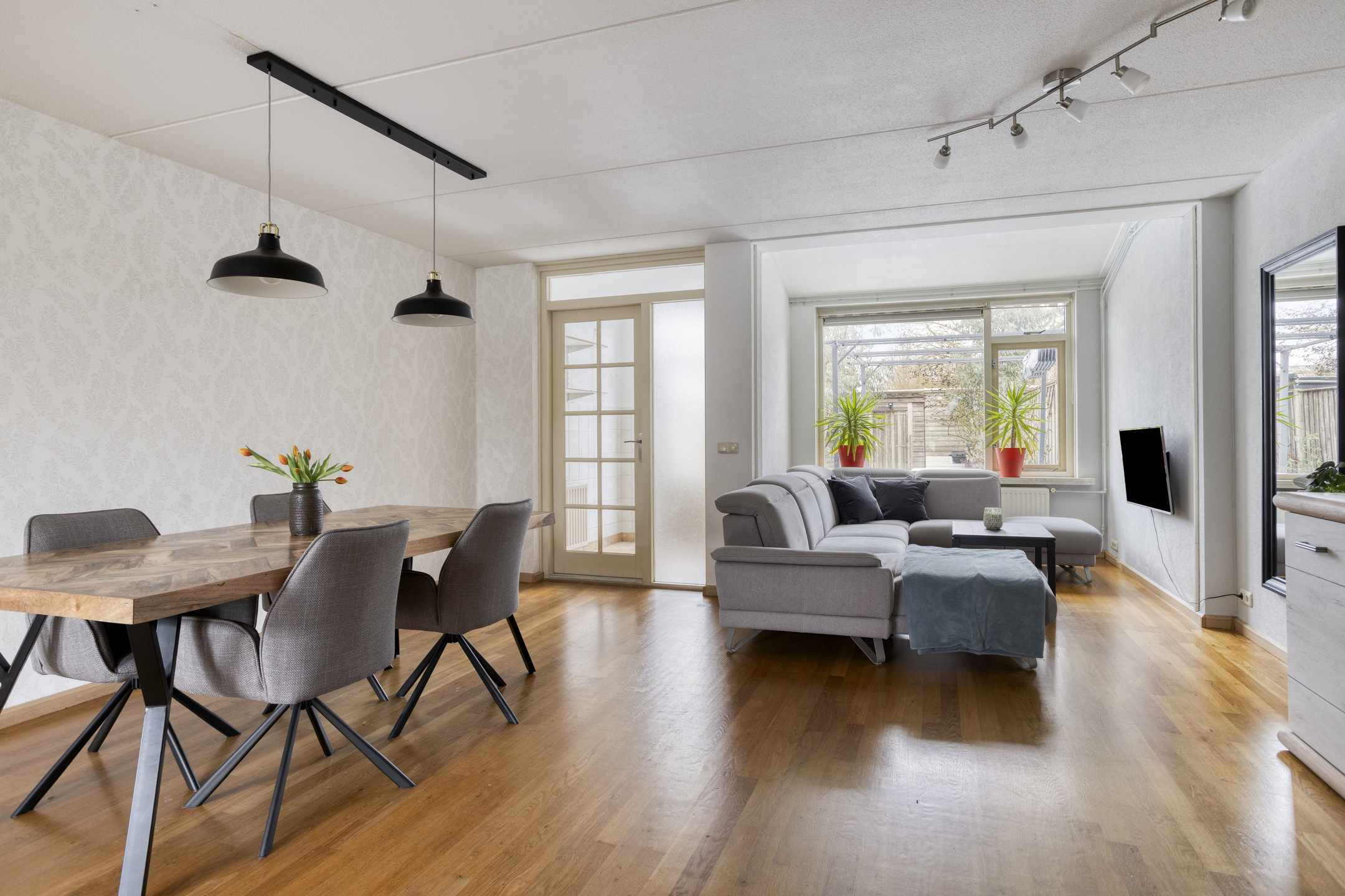 - Tuingerichte woonkamer met trapkast. Tussenportaal met toegang tot de tuin.