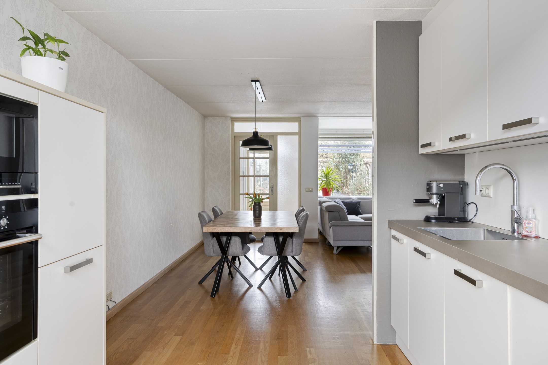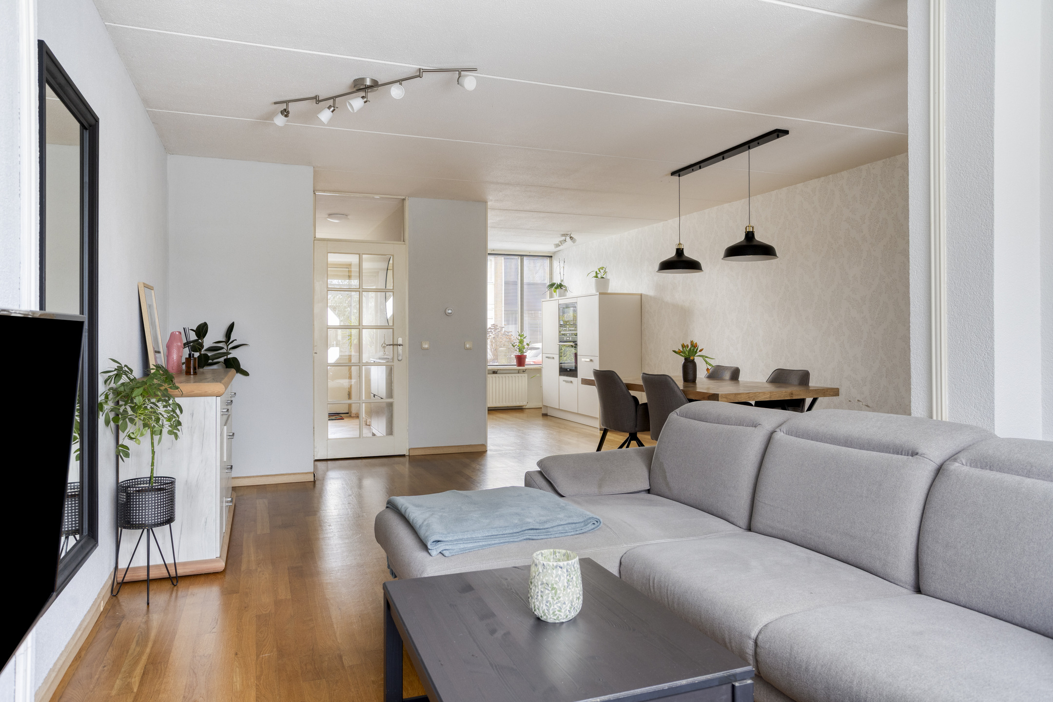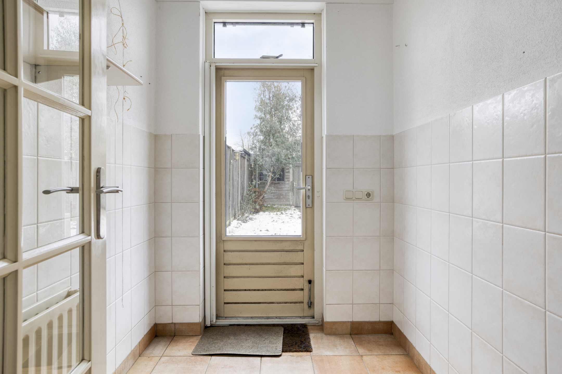- Tuingerichte woonkamer met trapkast. Tussenportaal met toegang tot de tuin.