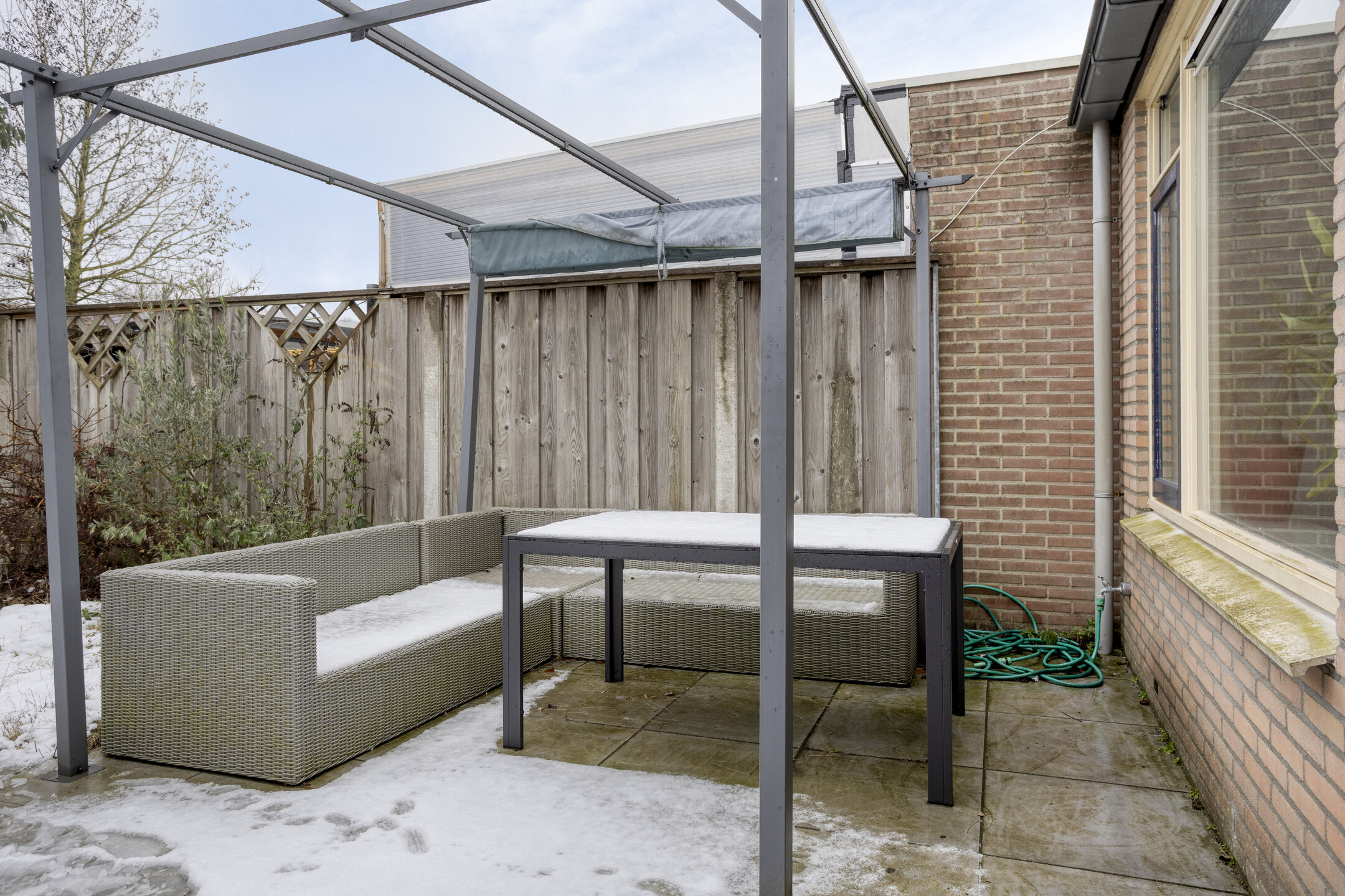 Buiten: de achtertuin ligt op het noorden, maar door de diepte is er volop zon. Achterin staat een vrijstaande houten berging met overkapping. De tuin is bereikbaar via een dubbele poort en grenst aan een speelplaats, ideaal voor kinderen.