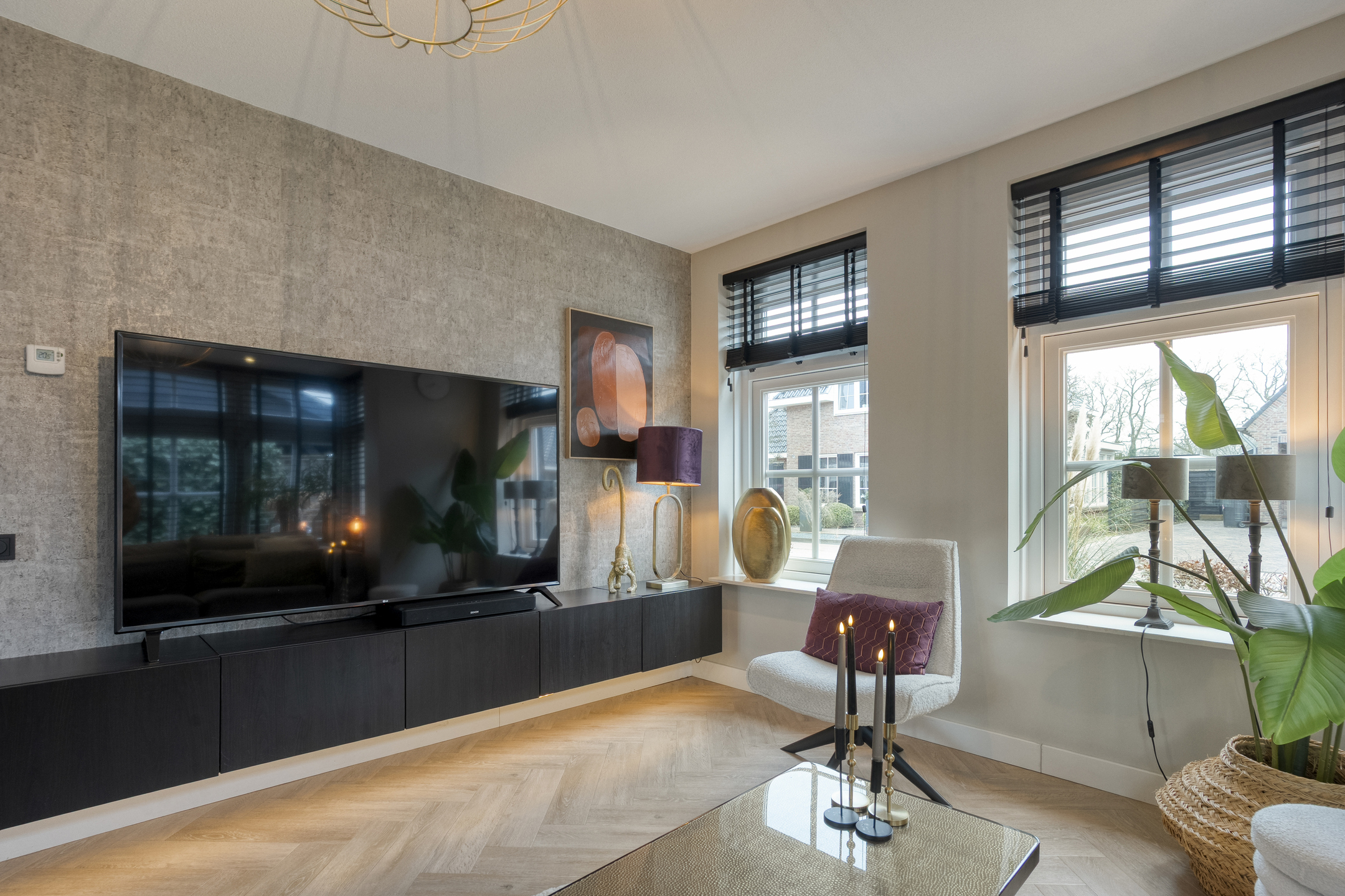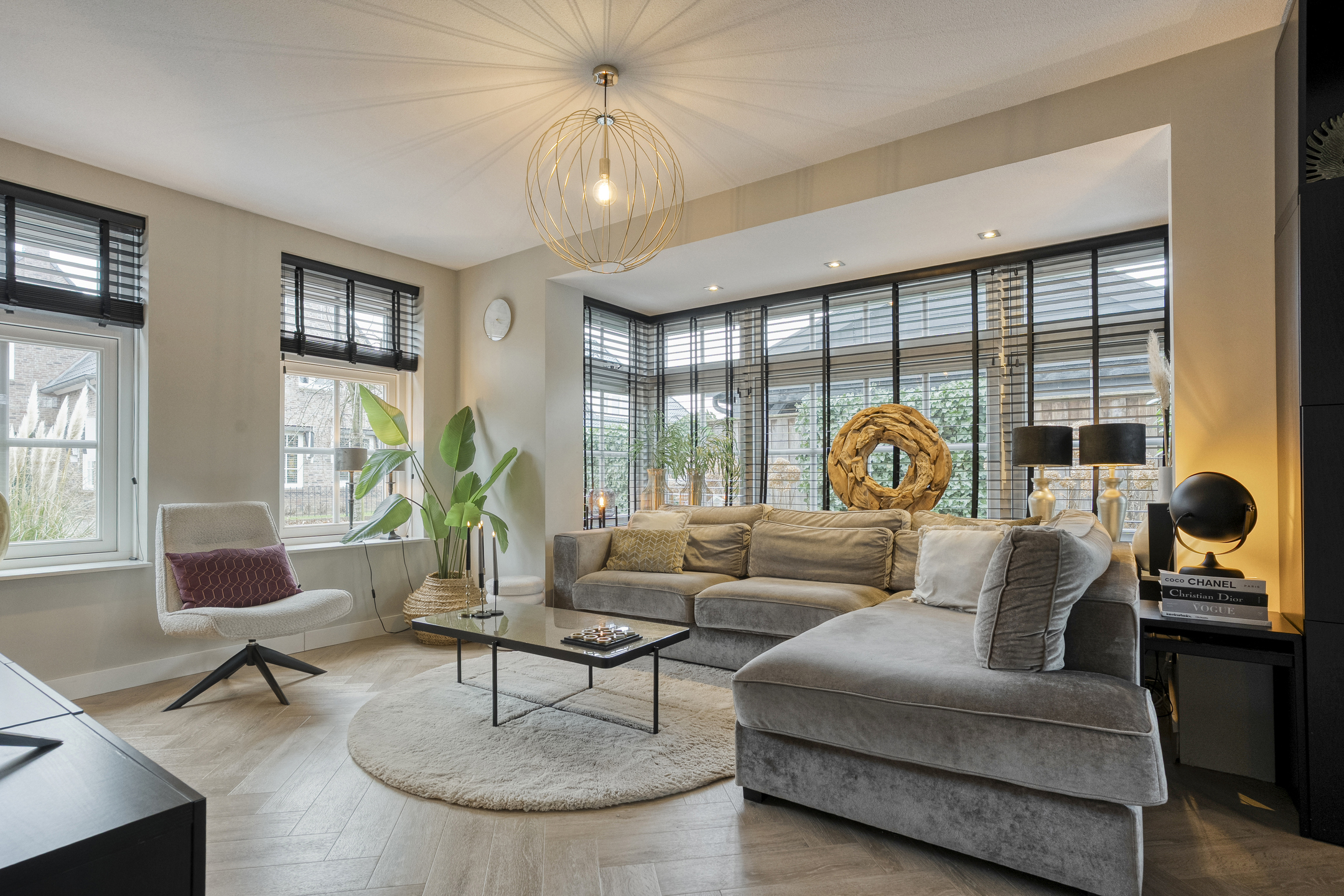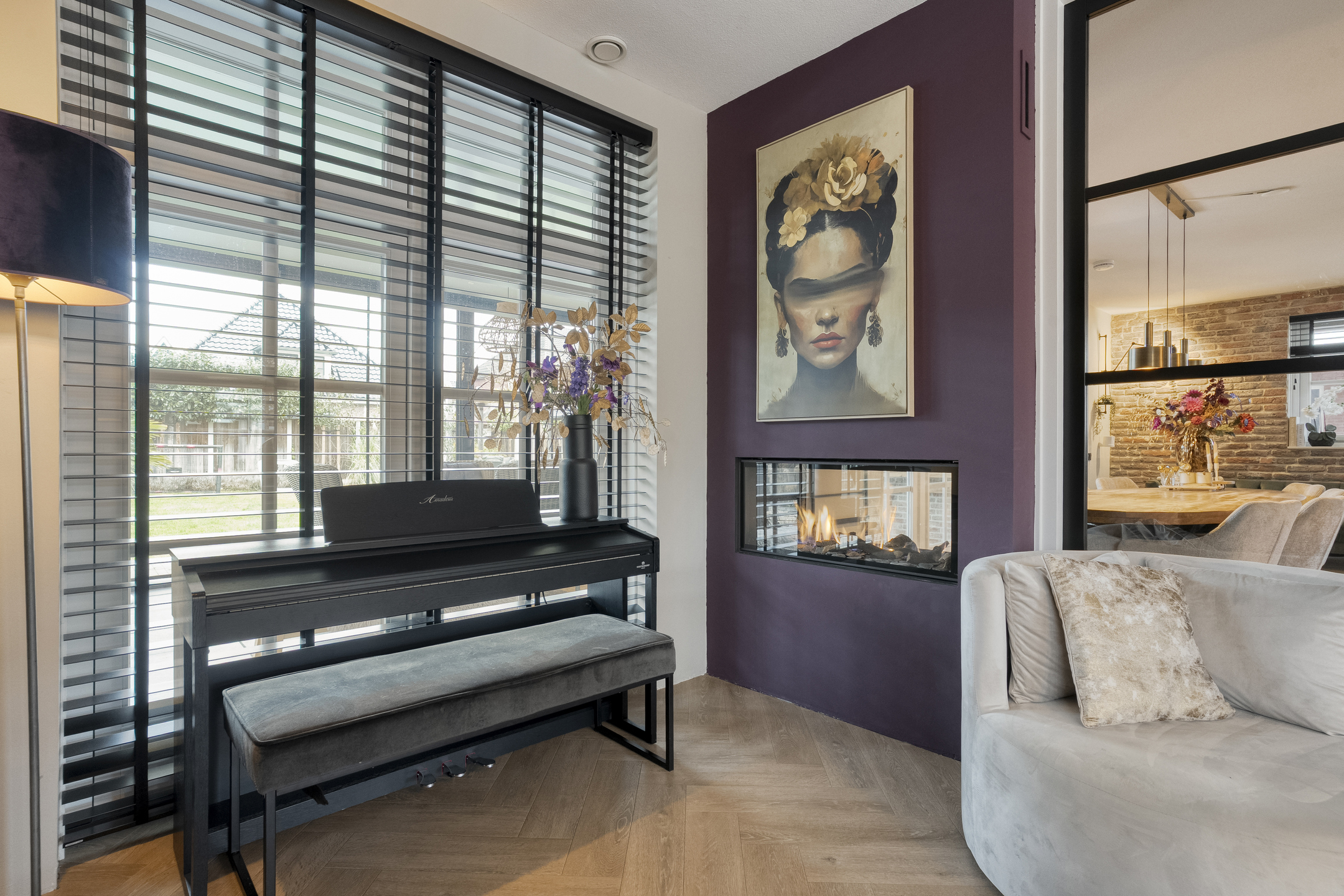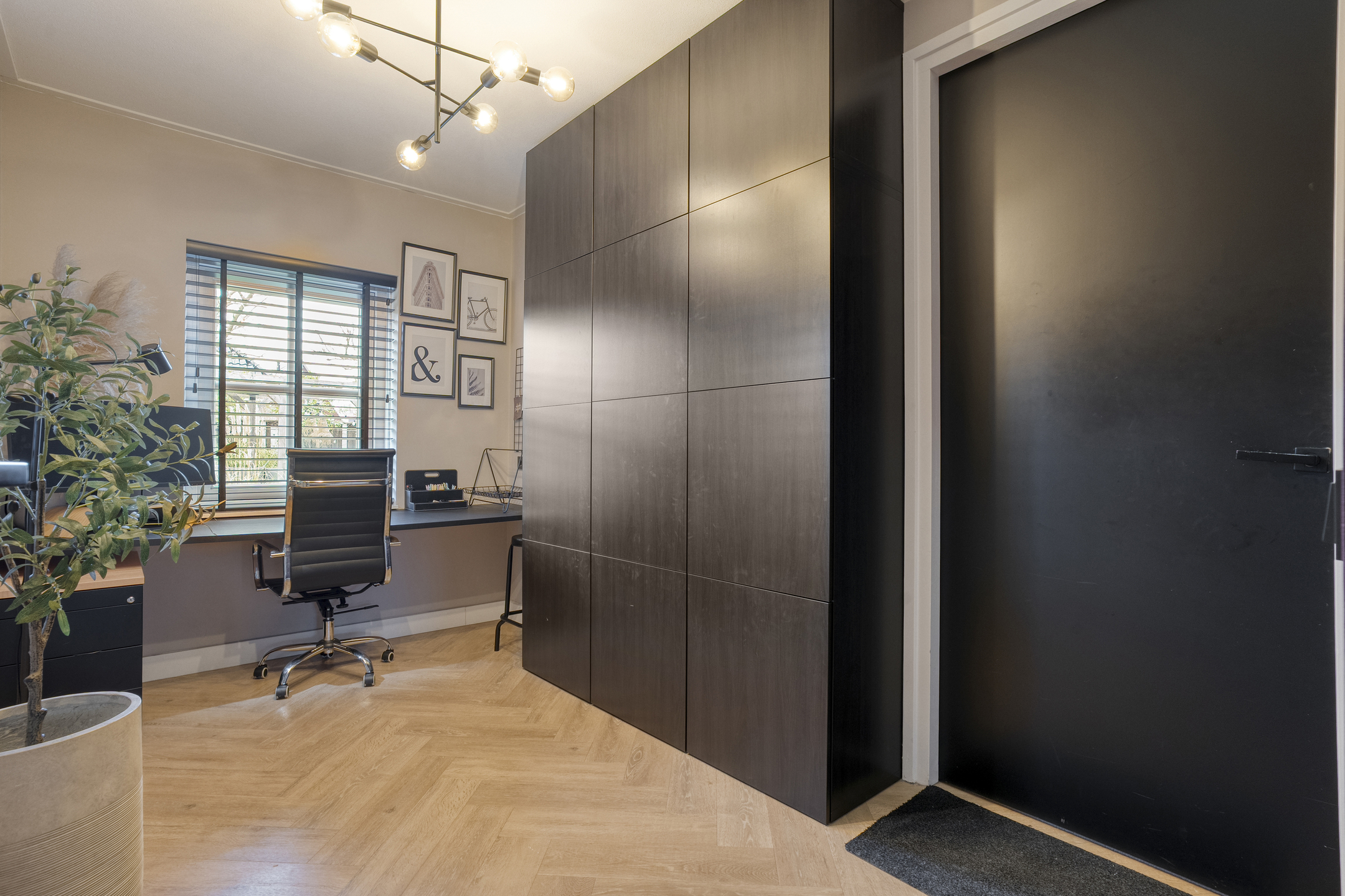 De woonkamer met zij-erker en doorkijkhaard voegt sfeer toe zonder het open karakter te verliezen. Daarnaast is er ruimte voor thuiswerken of studeren, prettig afgescheiden maar toch verbonden met de rest van het huis.