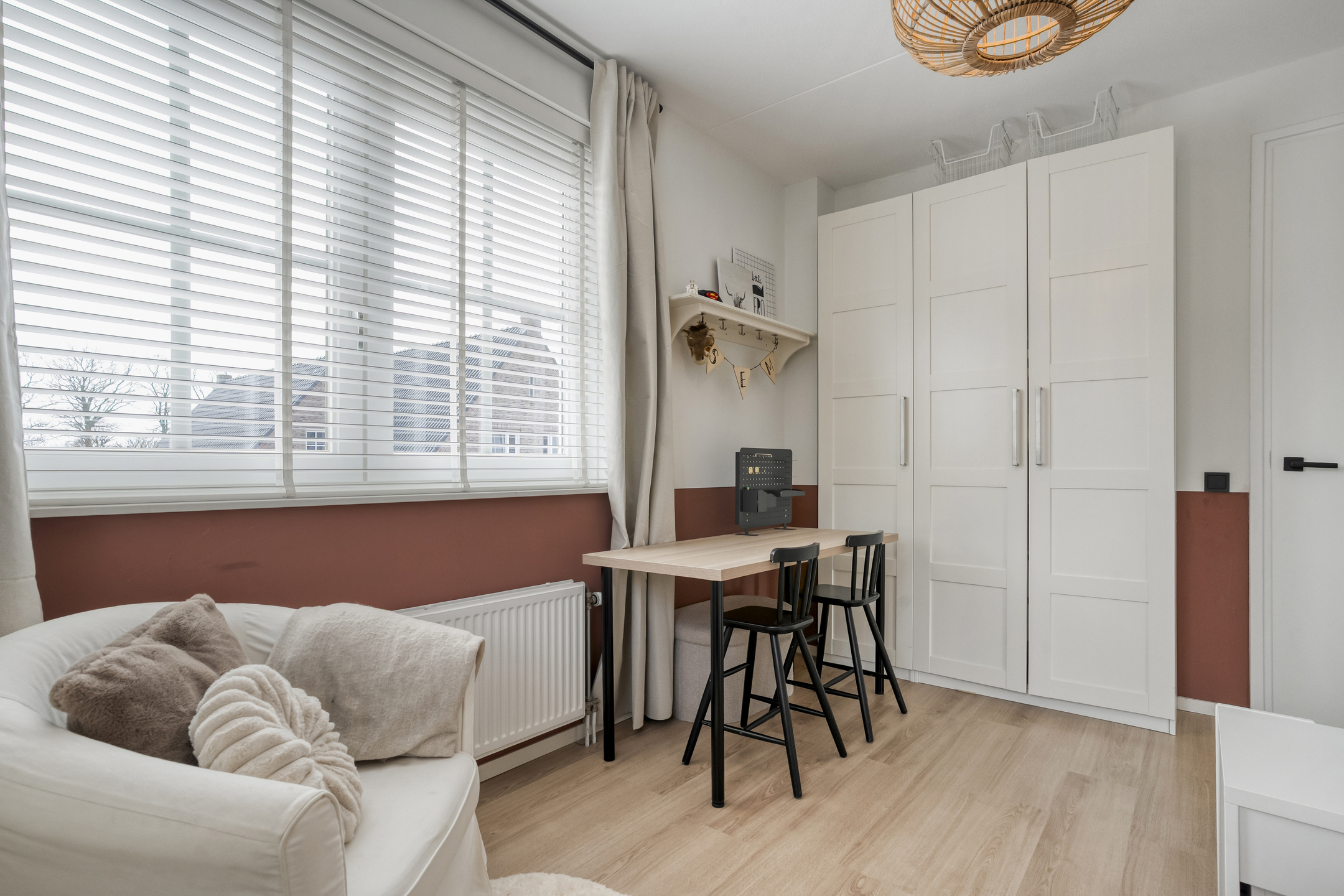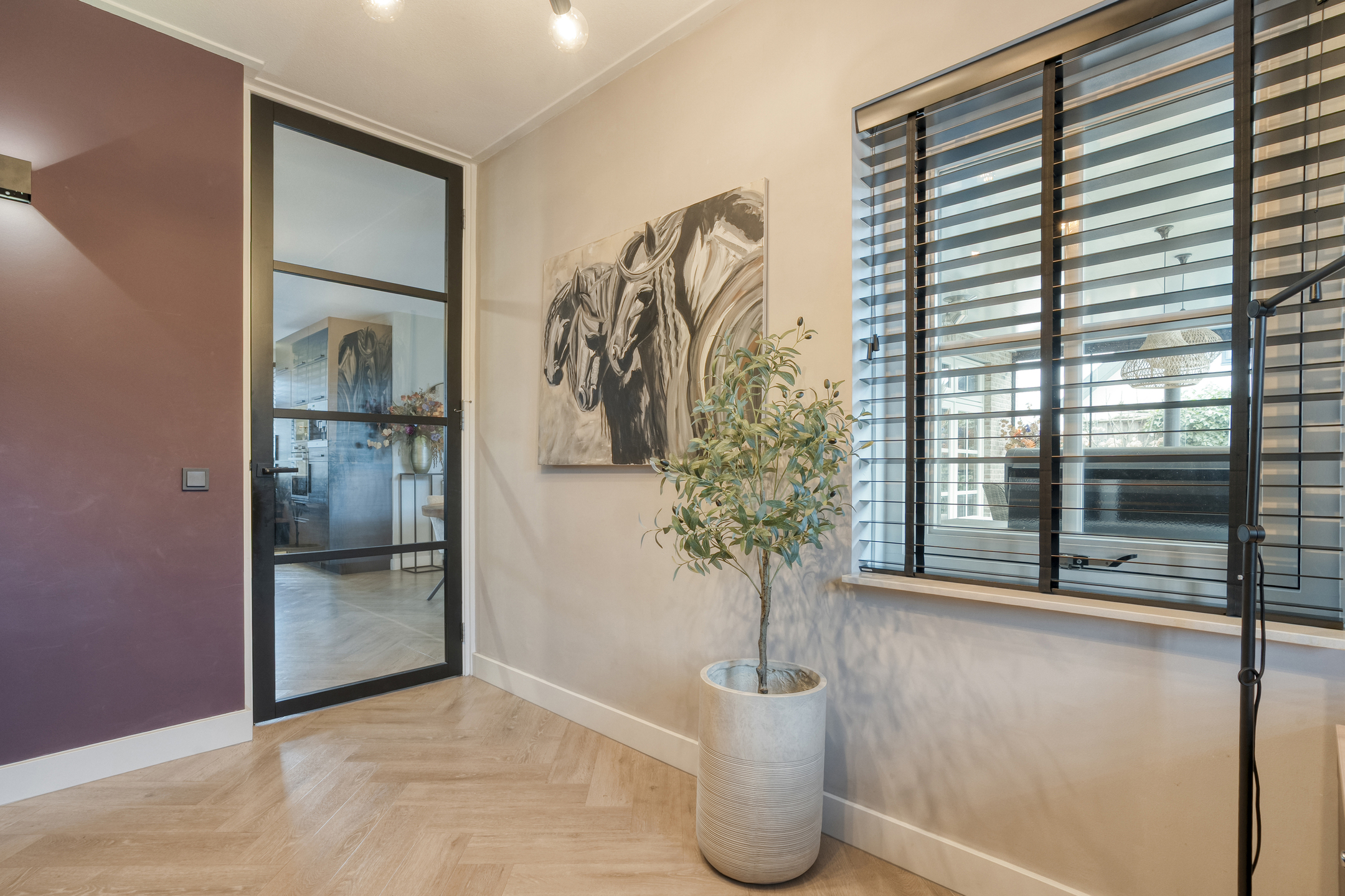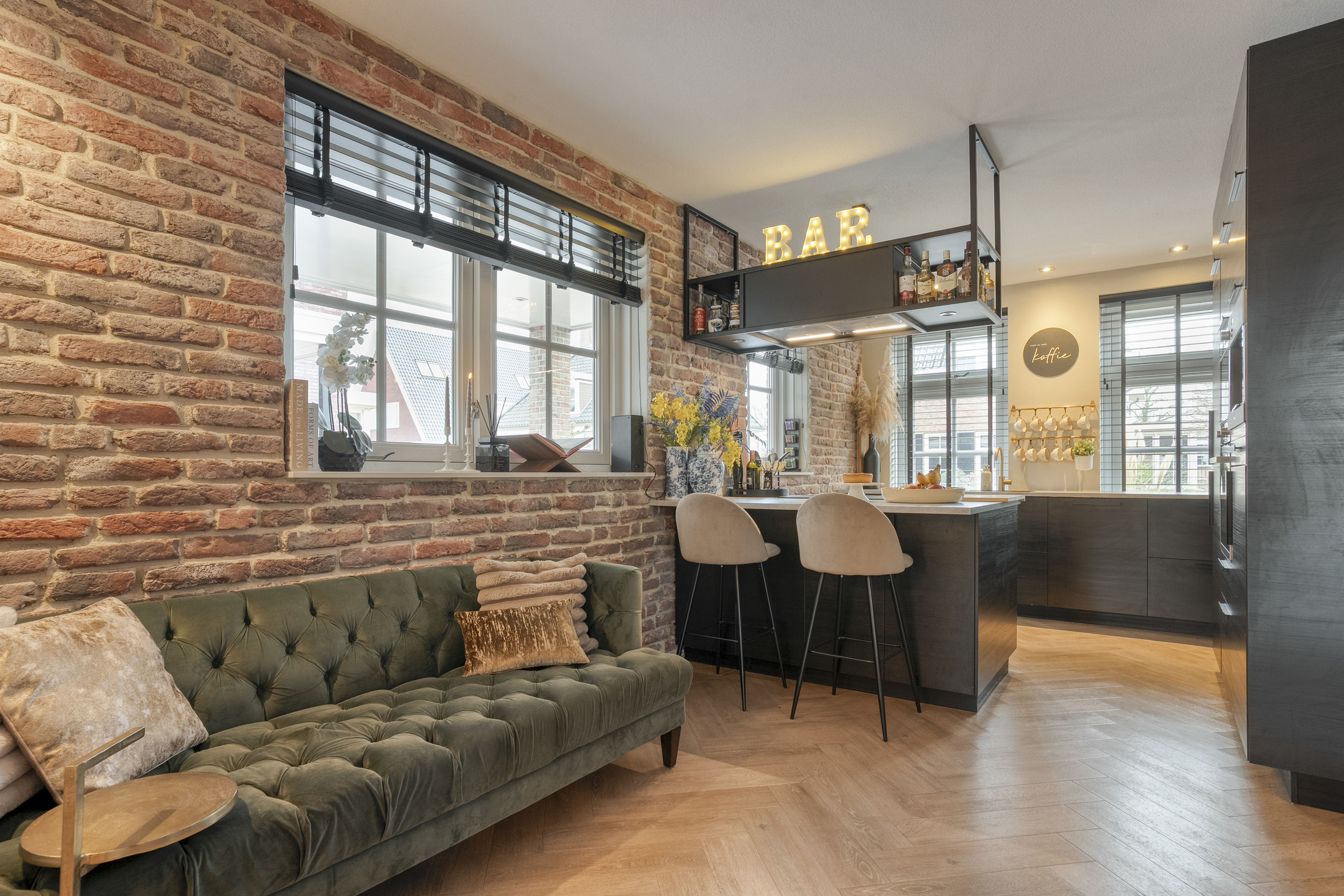 De woonkamer met zij-erker en doorkijkhaard voegt sfeer toe zonder het open karakter te verliezen. Daarnaast is er ruimte voor thuiswerken of studeren, prettig afgescheiden maar toch verbonden met de rest van het huis.