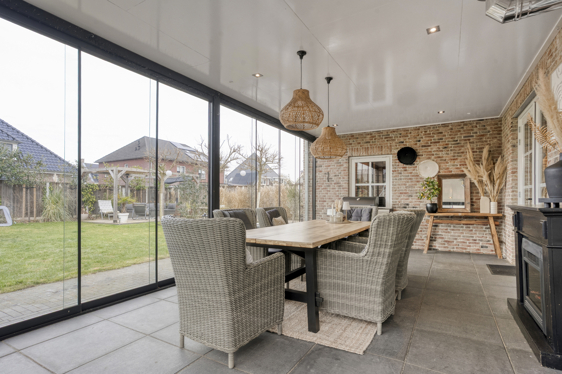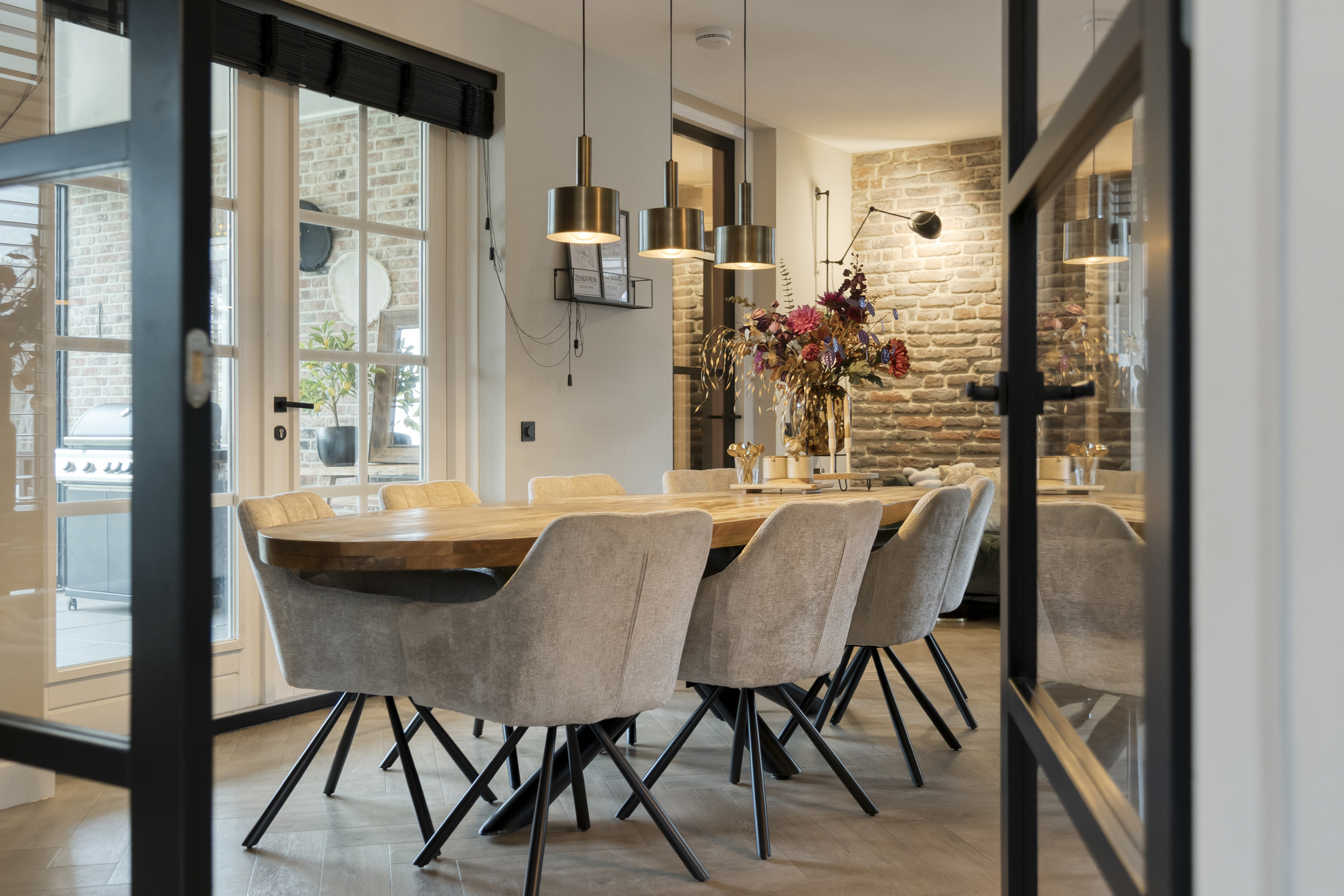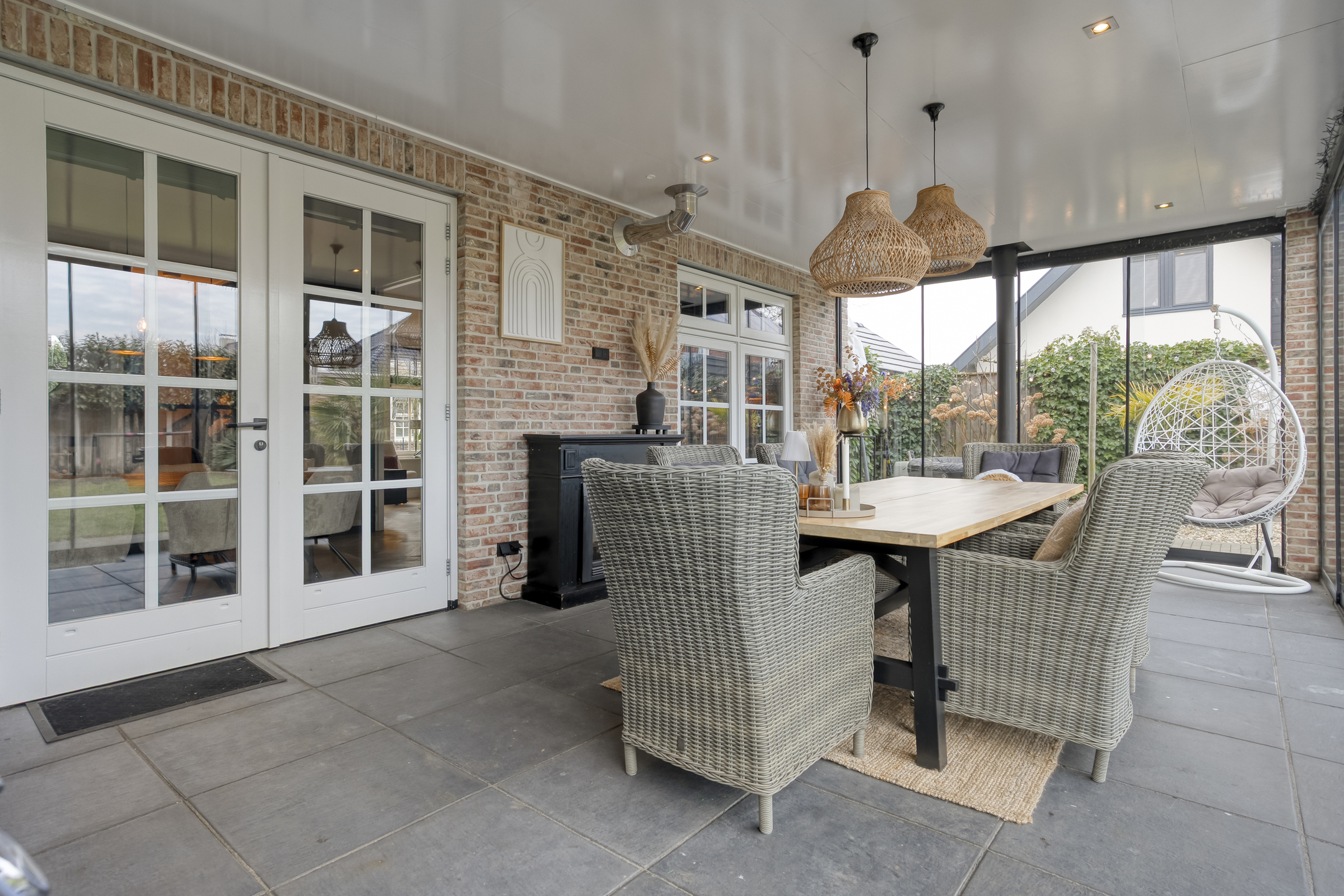 - Eetkamer met openslaande tuindeuren naar de luxe terrasoverkapping.
