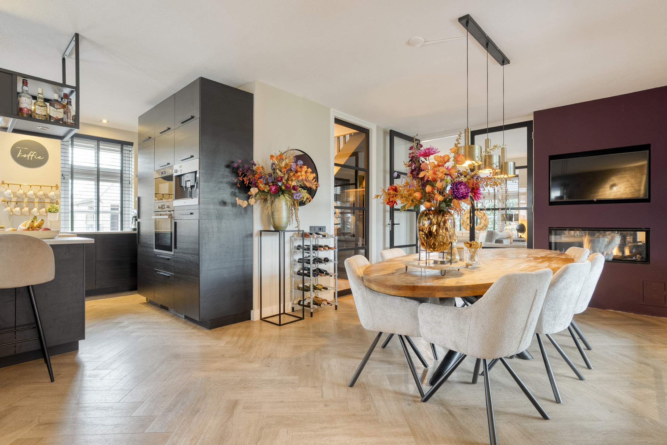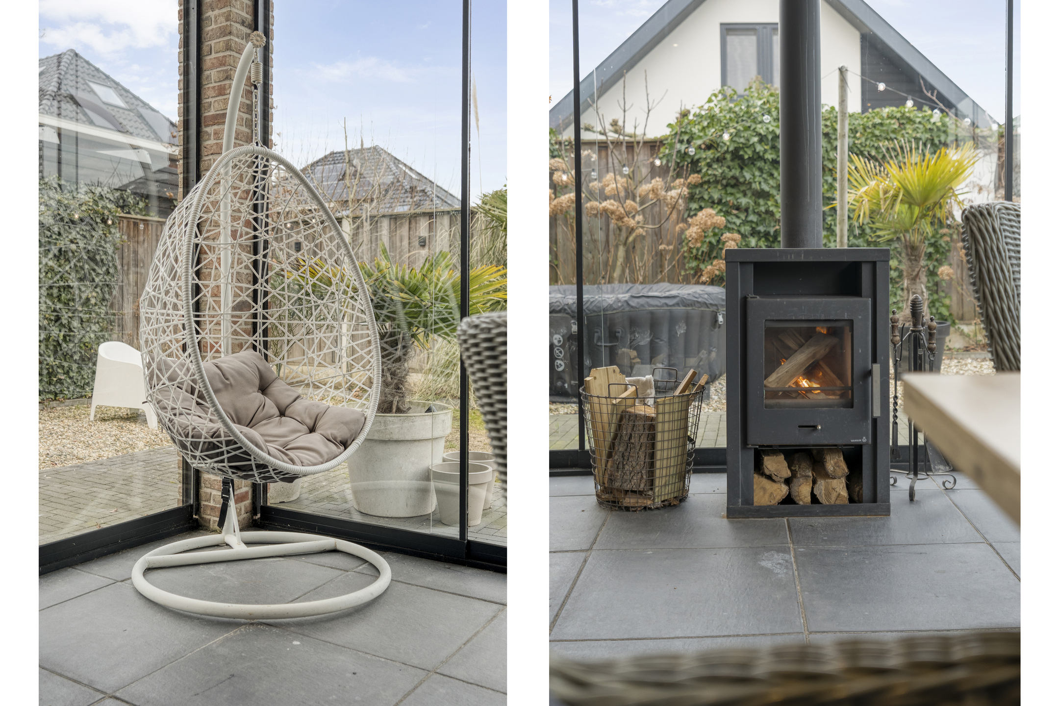 Binnen valt direct de rust en ruimtelijkheid op. De afwerking is modern en warm tegelijk, met een prettige vanzelfsprekendheid: dit is geen showroom, dit is een huis dat klopt. De woonkeuken en eetkamer vormen samen het kloppend hart van de woning. Grote openslaande deuren trekken buiten naar binnen en maken de overgang naar de royale terrasoverkapping naadloos. Met glazen schuifwanden rondom en een houtkachel is dit een plek waar seizoenen vervagen en avonden langer mogen duren.