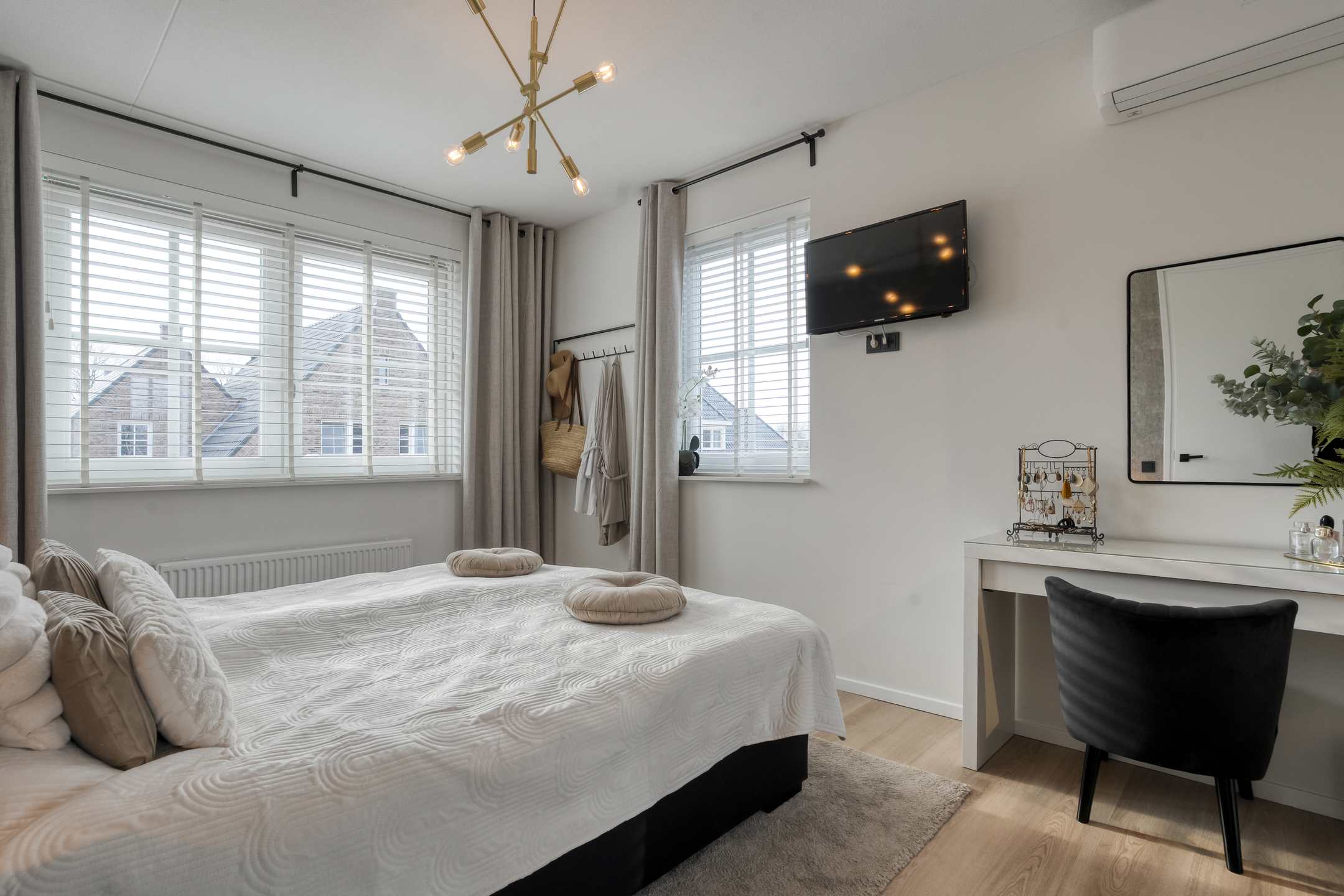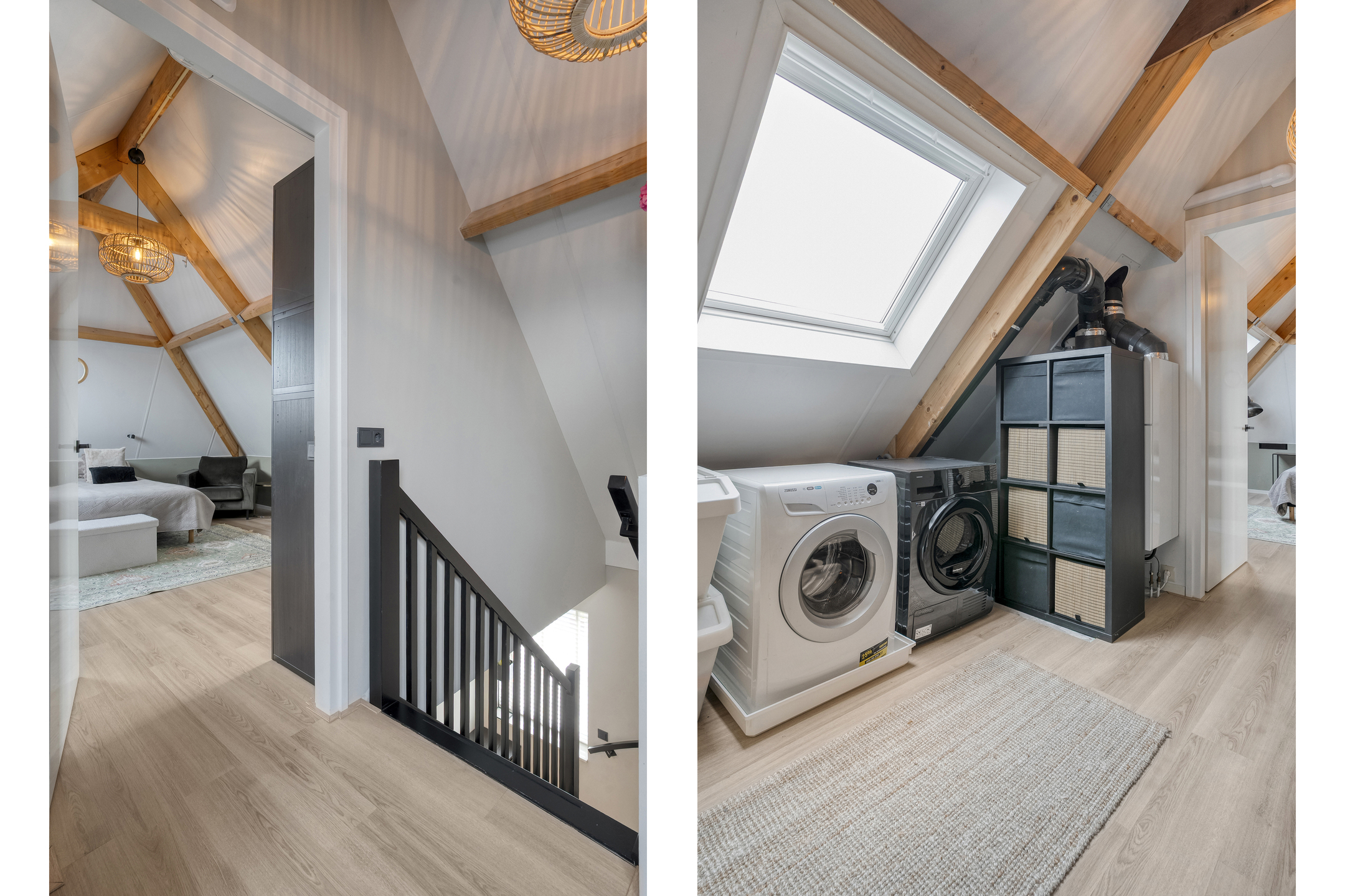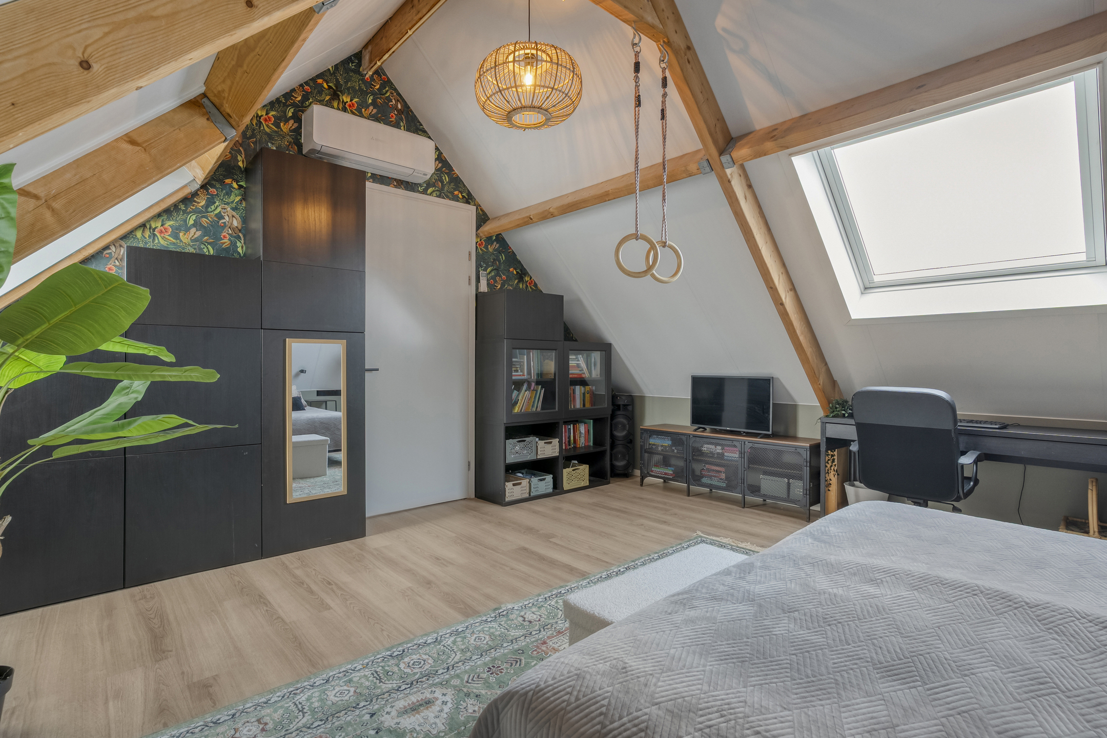 Boven wachten vier volwaardige slaapkamers, waaronder een heerlijke master bedroom met walk in closet. De badkamer is luxe en comfortabel ingericht, een plek waar je de dag rustig begint en ontspannen afsluit. Ook de zolderverdieping is volledig benut en voelt dankzij dakkapel, dakramen en airconditioning als een volwaardig woonniveau.