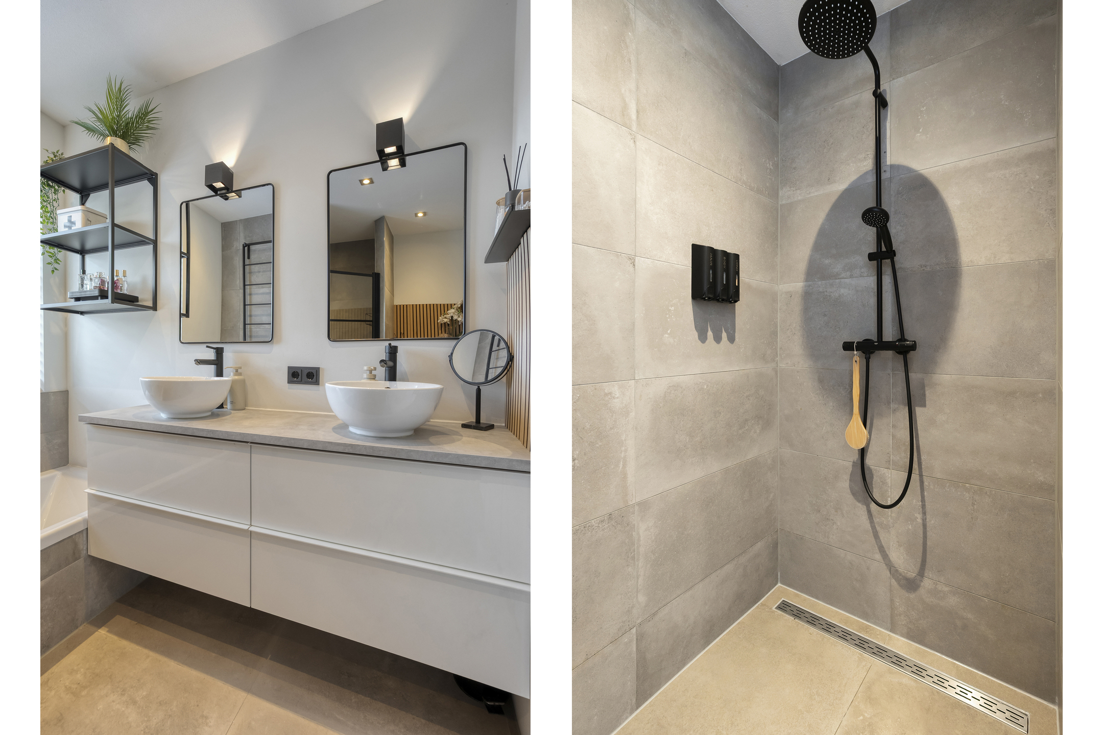 - Moderne badkamer met ligbad, inloopdouche, dubbele wastafel, hangend toilet en vloerverwarming.