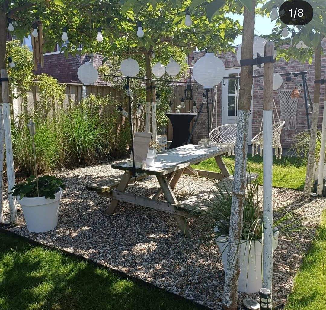 - Achtertuin op het noordwesten, netjes aangelegd en verrassend ruim, met altijd zon én schaduw.