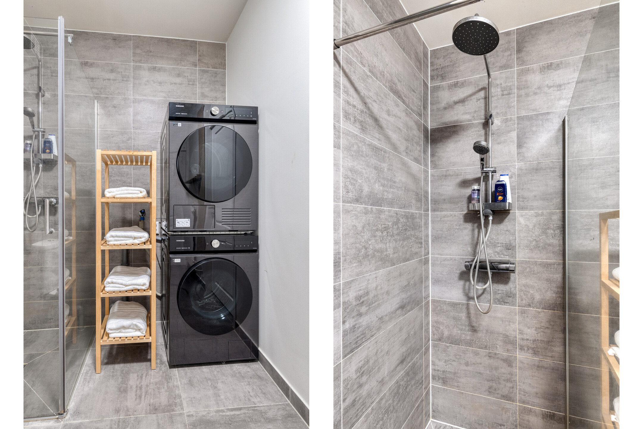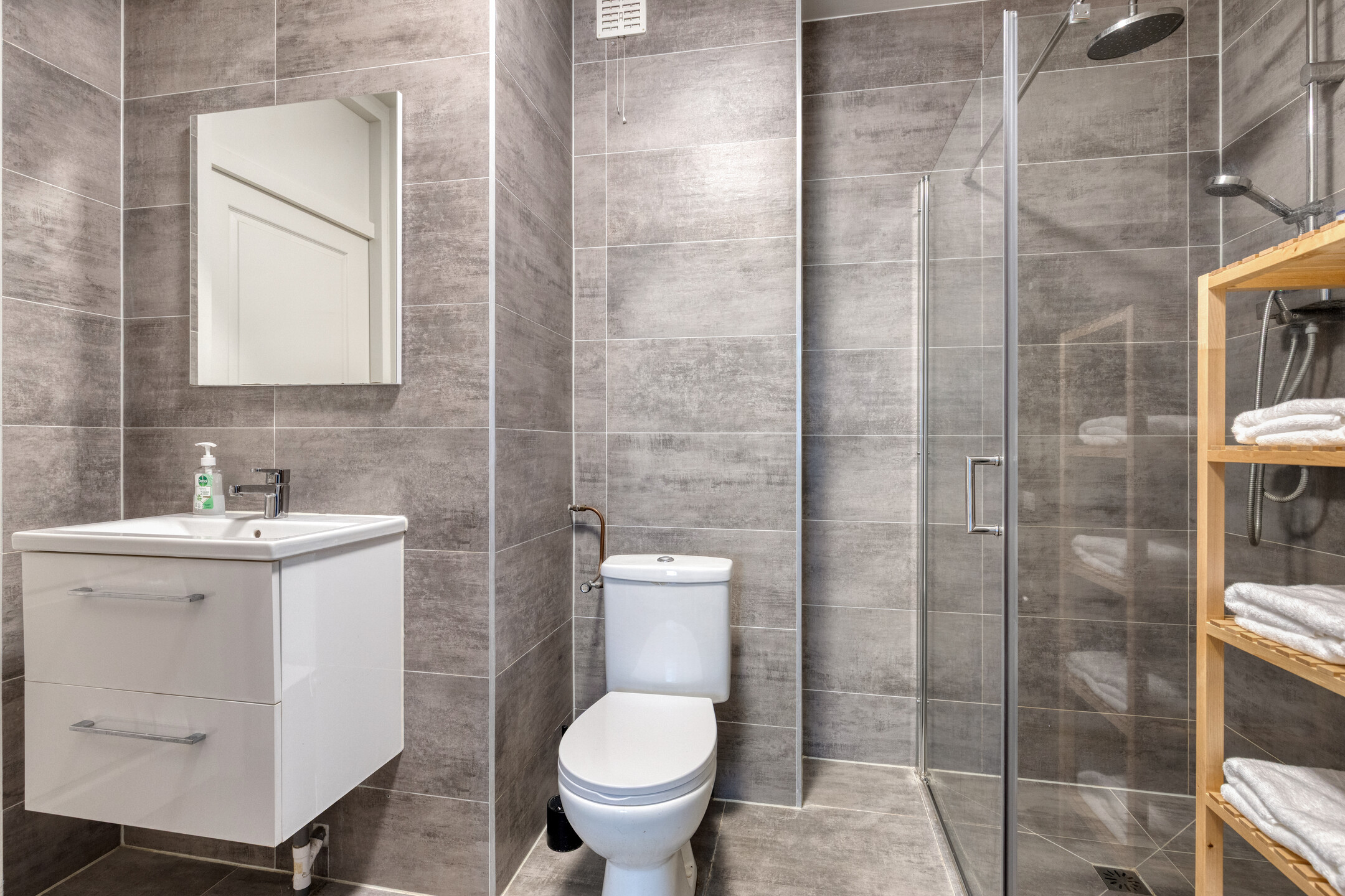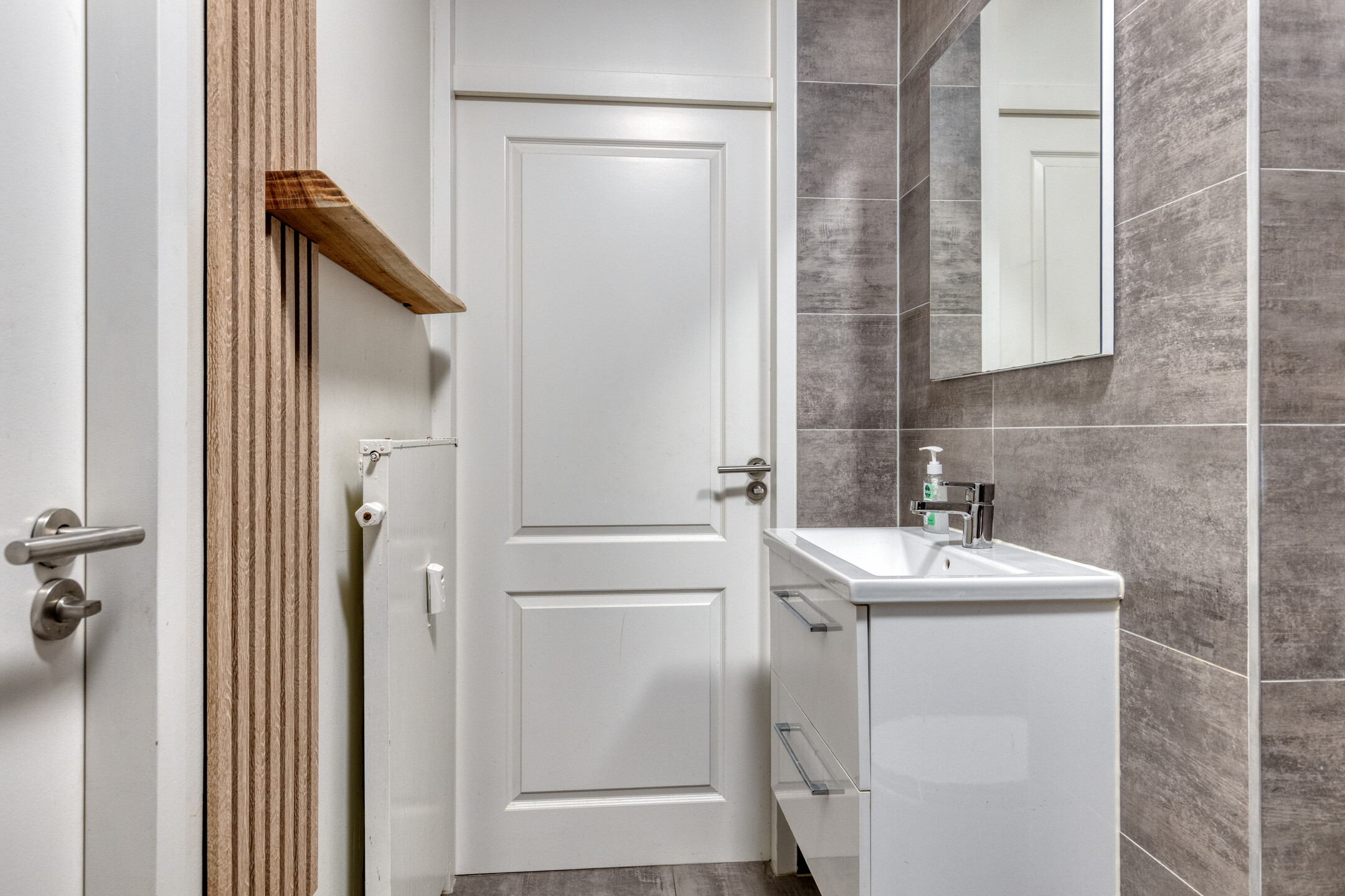- Inpandige badkamer met douche, wastafelmeubel, toilet en witgoedaansluiting.